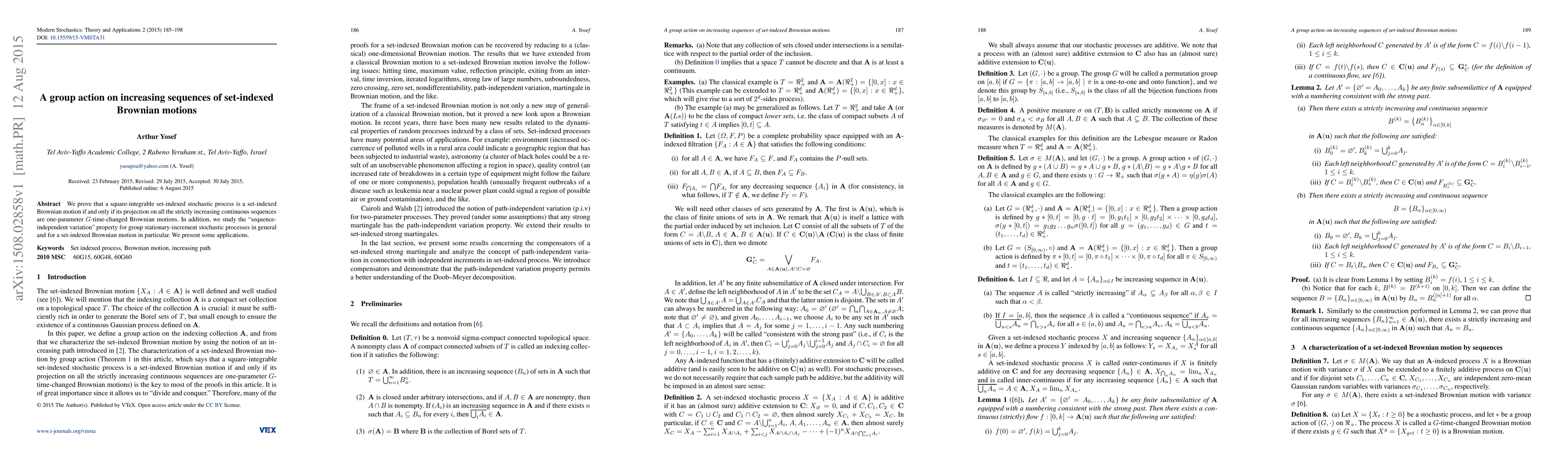 This paper proves that a square-integrable set-indexed stochastic process is a set-indexed Brownian motion if its projections on all strictly increasing continuous sequences are one-parameter $G$-time-changed Brownian motions. It also explores the "sequence-independent variation" property for group stationary-increment processes and presents applications.