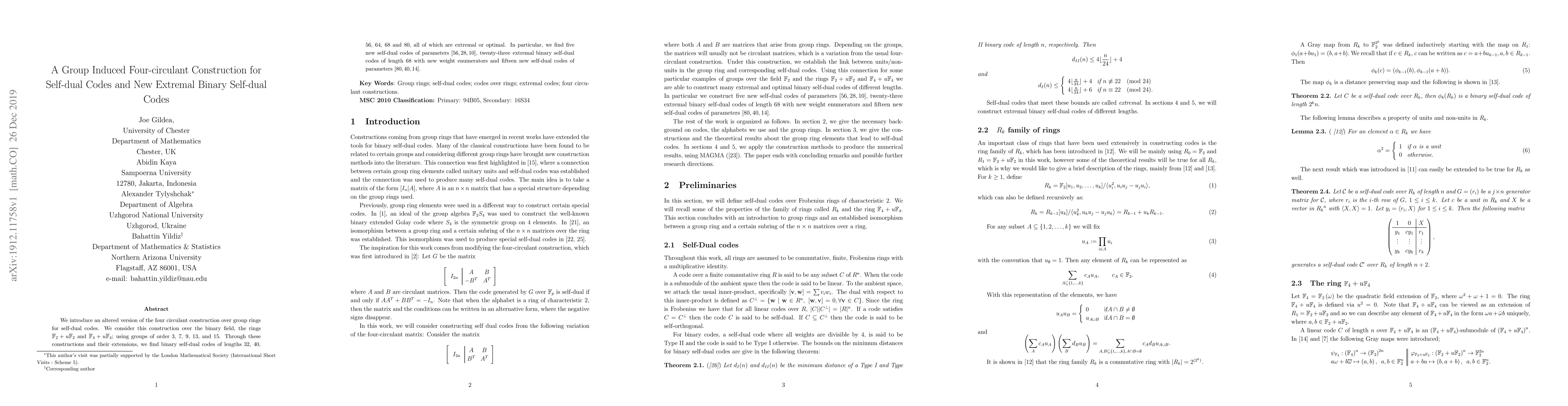 We introduce an altered version of the four circulant construction over group rings for self-dual codes. We consider this construction over the binary field, the rings F_2 + uF_2 and F_4 + uF_4; using groups of order 3, 7, 9, 13, and 15. Through these constructions and their extensions, we find binary self-dual codes of lengths 32, 40, 56, 64, 68 and 80, all of which are extremal or optimal. In particular, we find five new self-dual codes of parameters [56, 28, 10], twenty-three extremal binary self-dual codes of length 68 with new weight enumerators and fifteen new self-dual codes of parameters [80, 40, 14].