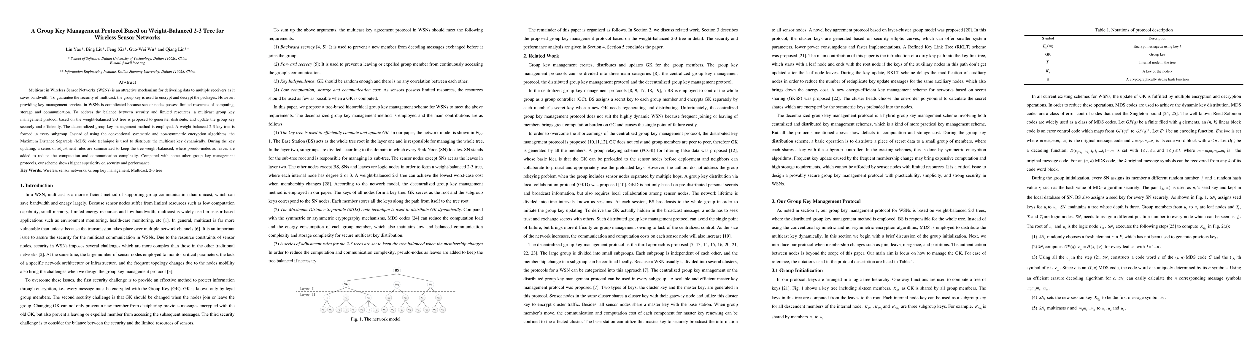 This paper proposes a weight-balanced 2-3 tree-based group key management protocol for wireless sensor networks to efficiently distribute and update multicast keys while balancing security and resource constraints. The protocol uses MDS code technique and pseudo-nodes to enhance security and reduce computational complexity.