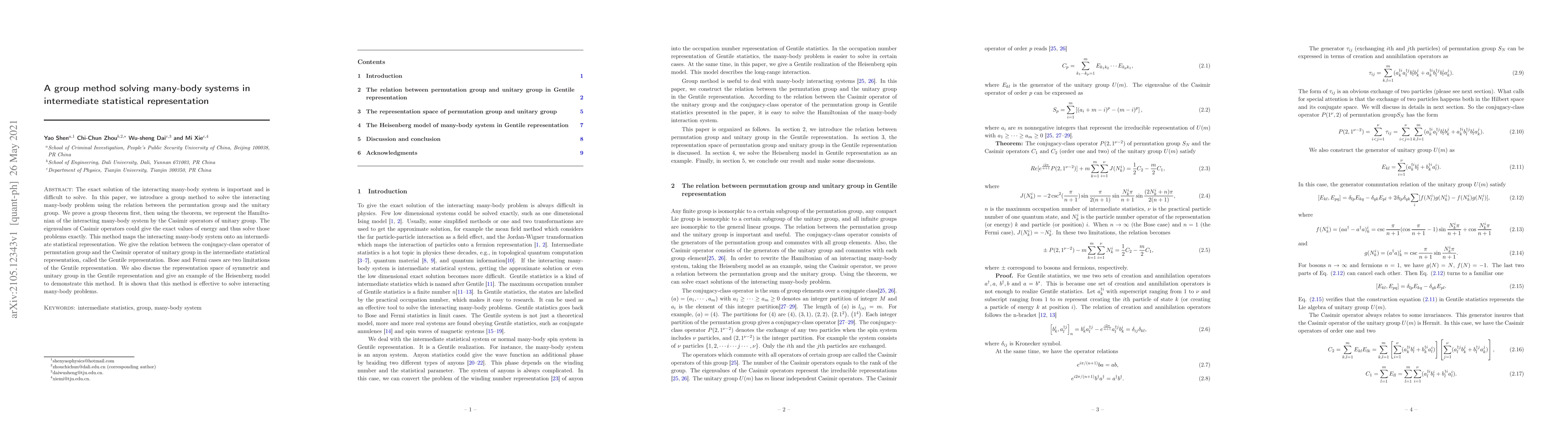 The exact solution of the interacting many-body system is important and is difficult to solve. In this paper, we introduce a group method to solve the interacting many-body problem using the relation between the permutation group and the unitary group. We prove a group theorem first, then using the theorem, we represent the Hamiltonian of the interacting many-body system by the Casimir operators of unitary group. The eigenvalues of Casimir operators could give the exact values of energy and thus solve those problems exactly. This method maps the interacting many-body system onto an intermediate statistical representation. We give the relation between the conjugacy-class operator of permutation group and the Casimir operator of unitary group in the intermediate statistical representation, called the Gentile representation. Bose and Fermi cases are two limitations of the Gentile representation. We also discuss the representation space of symmetric and unitary group in the Gentile representation and give an example of the Heisenberg model to demonstrate this method. It is shown that this method is effective to solve interacting many-body problems.