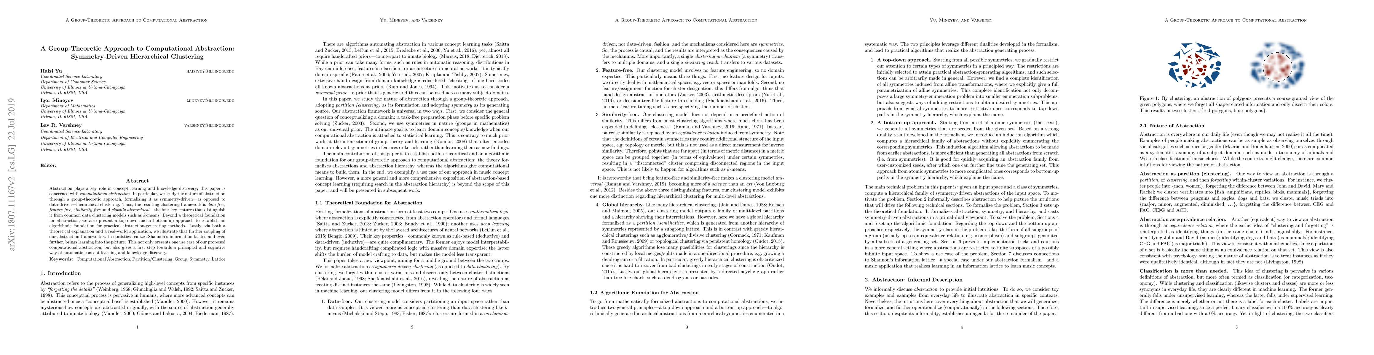 The paper proposes a group-theoretic approach to computational abstraction, utilizing symmetry-driven hierarchical clustering as opposed to data-driven methods. It formalizes abstraction as a data-free, feature-free, and similarity-free process, resulting in a globally hierarchical clustering framework distinct from common data clustering models.