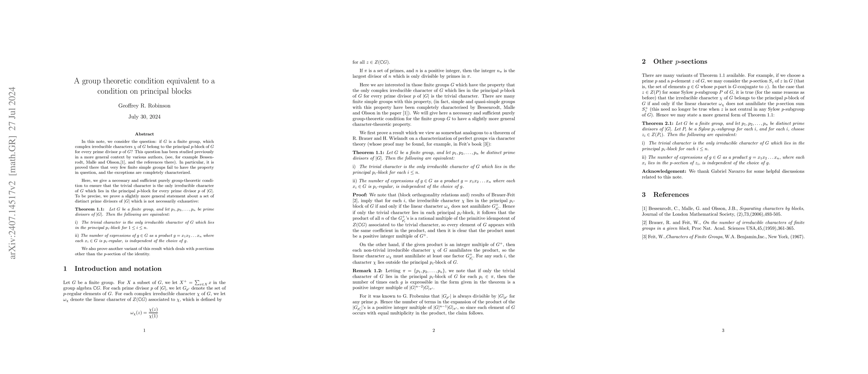 Summary: This paper presents a group-theoretic condition equivalent to ensuring that the trivial character is the sole irreducible character in the principal p-block for specified primes p dividing the order of a finite group G. Prior character-theoretic studies by various authors inform this investigation.