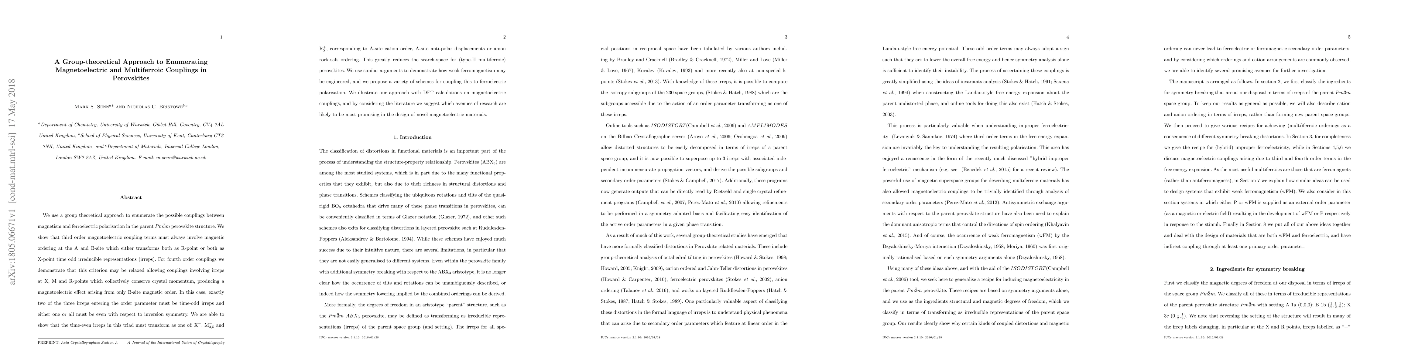 This paper uses group theory to systematically enumerate magnetoelectric and multiferroic couplings in perovskite structures, identifying specific magnetic orderings and irreducible representations that lead to magnetoelectric effects. The study highlights that third-order couplings require magnetic ordering at both A and B sites, while fourth-order couplings allow for B-site magnetic order alone, reducing the search for type-II multiferroic perovskites.