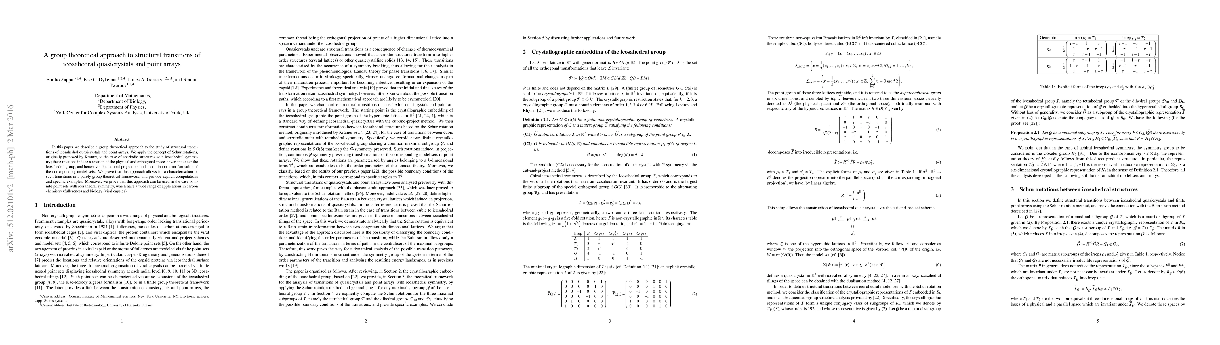 This paper employs group theory, specifically Schur rotations, to characterize structural transitions in icosahedral quasicrystals and point arrays, demonstrating its applicability to aperiodic structures and finite point sets with icosahedral symmetry, with implications for carbon chemistry and biology.