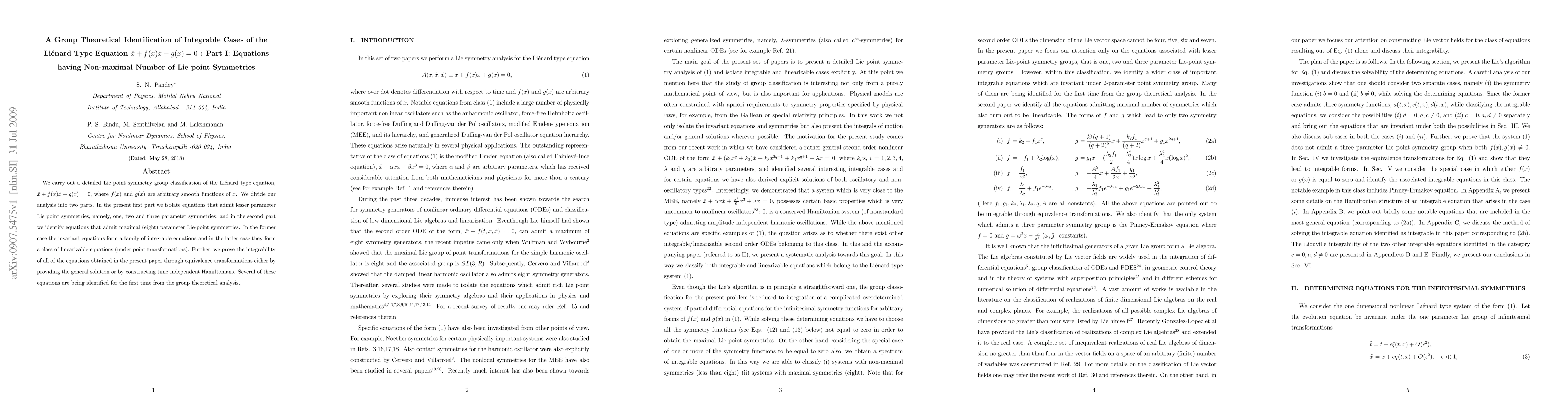 We carry out a detailed Lie point symmetry group classification of the Li\'enard type equation, $\ddot{x}+f(x)\dot{x}+g(x) = 0$, where $f(x)$ and $g(x)$ are arbitrary smooth functions of $x$. We divide our analysis into two parts. In the present first part we isolate equations that admit lesser parameter Lie point symmetries, namely, one, two and three parameter symmetries, and in the second part we identify equations that admit maximal (eight) parameter Lie-point symmetries. In the former case the invariant equations form a family of integrable equations and in the latter case they form a class of linearizable equations (under point transformations). Further, we prove the integrability of all of the equations obtained in the present paper through equivalence transformations either by providing the general solution or by constructing time independent Hamiltonians. Several of these equations are being identified for the first time from the group theoretical analysis.