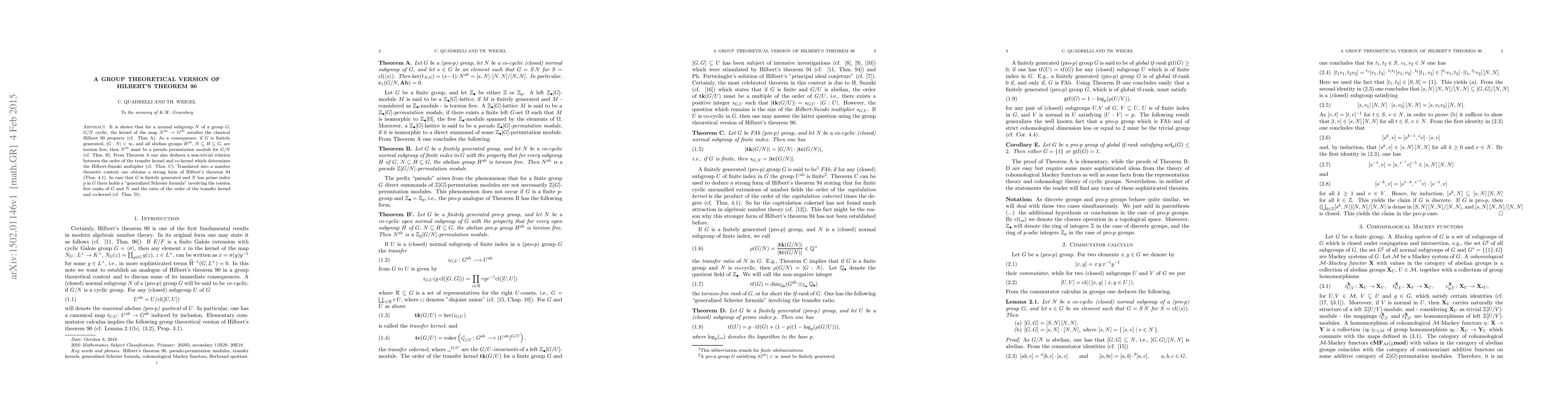 This paper establishes a group theoretical version of Hilbert's theorem 90, showing that for a cyclic quotient group $G/N$, the kernel of the map $N^{\mathrm{ab}} \to G^{\mathrm{ab}$ satisfies the classical Hilbert 90 property. It also deduces a generalized Schreier formula for finitely generated groups with a subgroup of prime index.
