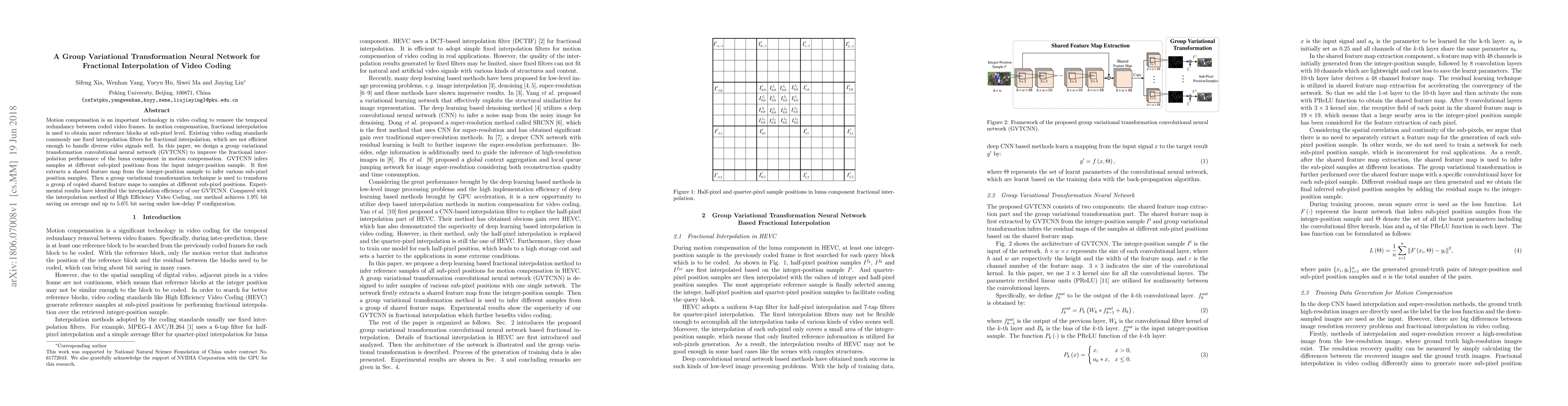 This paper proposes a Group Variational Transformation Convolutional Neural Network (GVTCNN) to enhance fractional interpolation in video coding's motion compensation, achieving better performance than existing methods. The GVTCNN improves luma component interpolation efficiency, resulting in up to 5.6% bit saving under low-delay configurations.