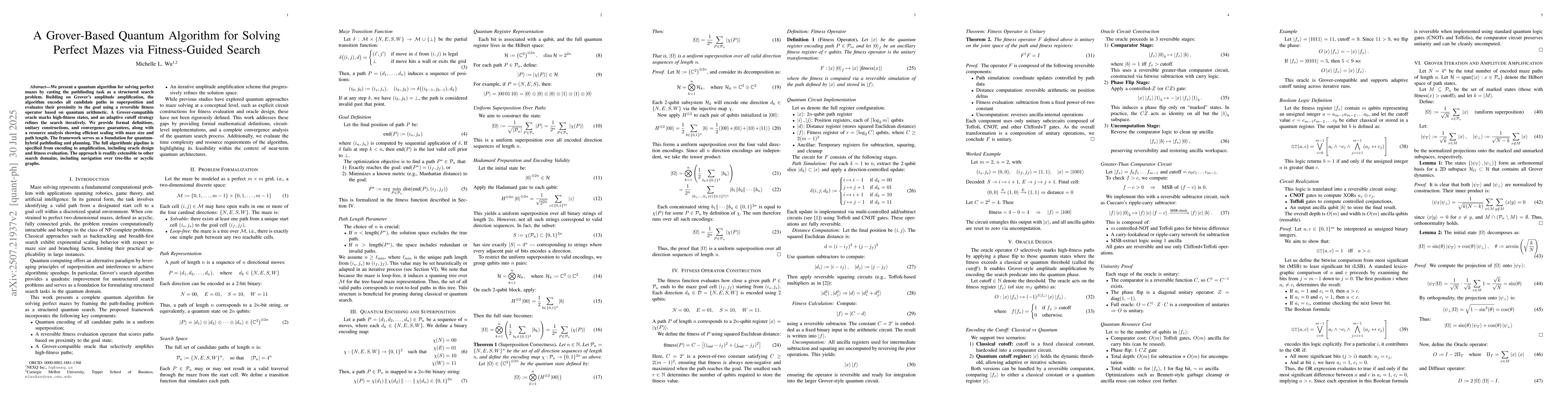 The research presents a quantum algorithm for solving perfect mazes using Grover's amplitude amplification, encoding candidate paths in superposition, and evaluating their proximity to the goal with a reversible fitness operator based on quantum arithmetic.