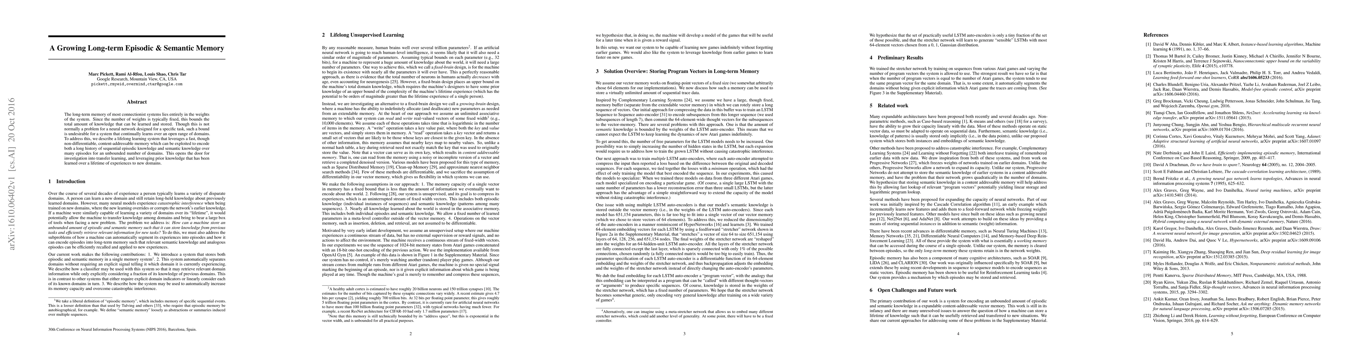 This paper proposes a lifelong learning system that uses a content-addressable memory to store an unbounded amount of episodic and semantic knowledge, addressing the limitations of traditional neural networks with fixed weight structures. This approach enables transfer learning and the use of accumulated knowledge across diverse domains.