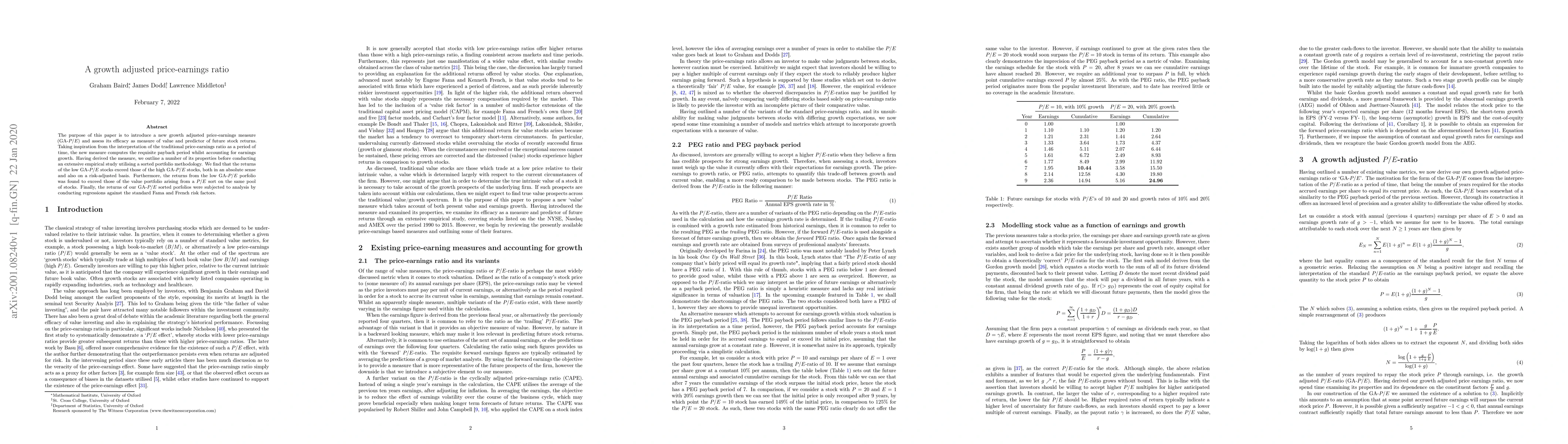 A new growth-adjusted price-earnings ratio (GA-P/E) measure was developed to assess value and predict future stock returns. Empirical study results showed that low GA-P/E stocks outperformed high GA-P/E stocks in both absolute and risk-adjusted terms.