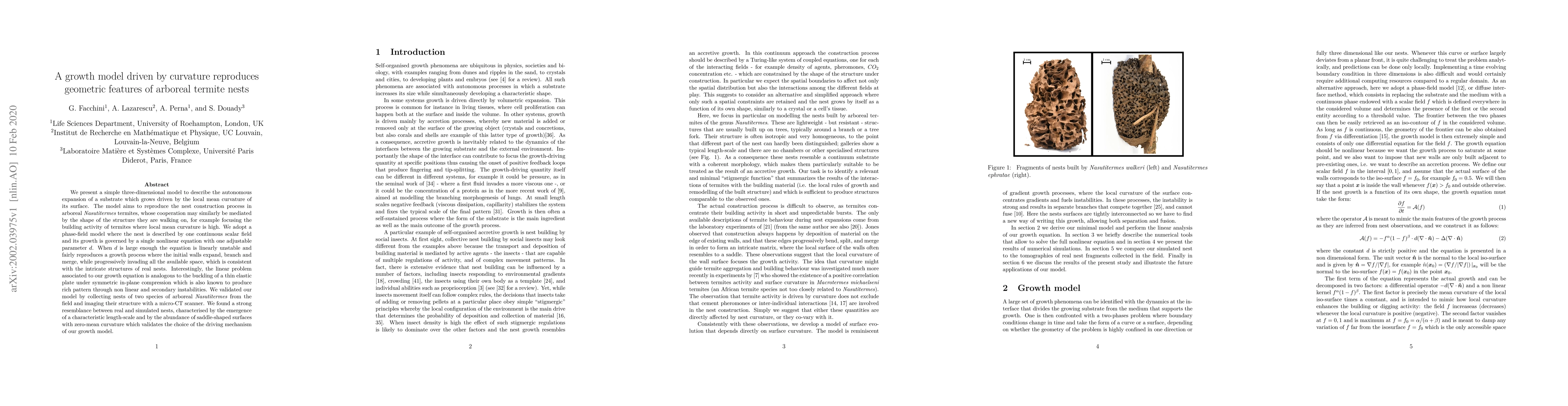 We present a simple three-dimensional model to describe the autonomous expansion of a substrate which grows driven by the local mean curvature of its surface. The model aims to reproduce the nest construction process in arboreal Nasutitermes termites, whose cooperation may similarly be mediated by the shape of the structure they are walking on, for example focusing the building activity of termites where local mean curvature is high. We adopt a phase-field model where the nest is described by one continuous scalar field and its growth is governed by a single nonlinear equation with one adjustable parameter d. When d is large enough the equation is linearly unstable and fairly reproduces a growth process where the initial walls expand, branch and merge, while progressively invading all the available space, which is consistent with the intricate structures of real nests. Interestingly, the linear problem associated to our growth equation is analogous to the buckling of a thin elastic plate under symmetric in-plane compression which is also known to produce rich pattern through non linear and secondary instabilities. We validated our model by collecting nests of two species of arboreal Nasutitermes from the field and imaging their structure with a micro-CT scanner. We found a strong resemblance between real and simulated nests, characterised by the emergence of a characteristic length-scale and by the abundance of saddle-shaped surfaces with zero-mean curvature which validates the choice of the driving mechanism of our growth model.