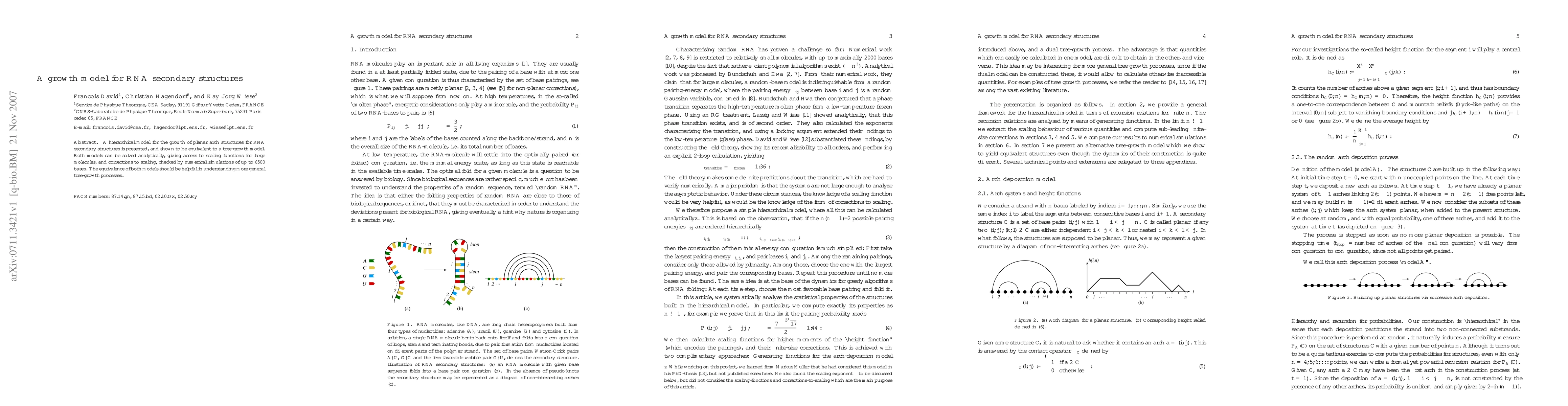 This paper introduces a hierarchical model for RNA secondary structures' growth, proving it equivalent to a tree-growth model. Both models allow analytical solutions, providing scaling functions for large RNA molecules and numerical simulations up to 6500 bases, validating their findings.