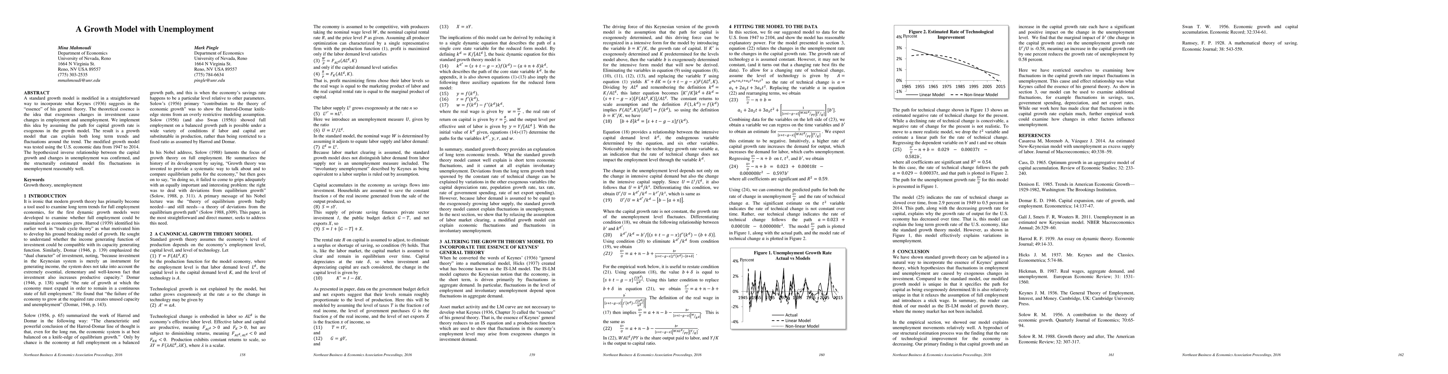 This paper modifies a standard growth model to incorporate Keynesian ideas, positing that exogenous investment changes affect employment and unemployment. The model, tested with U.S. data from 1947 to 2014, confirms the hypothesized inverse relationship between capital growth and unemployment fluctuations.