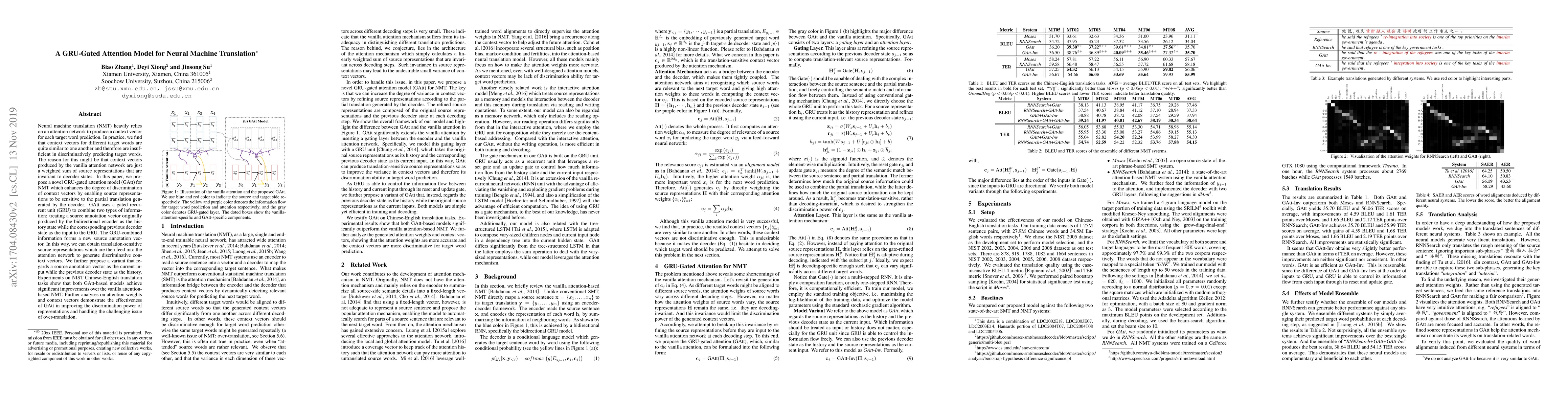 This paper proposes a GRU-gated attention model (GAtt) for neural machine translation (NMT) to enhance the discriminative power of context vectors. The model uses a gated recurrent unit (GRU) to integrate source representations with decoder states, generating translation-sensitive source annotations that improve context vector discrimination and reduce over-translation, achieving significant improvements over traditional attention-based models in NMT tasks.