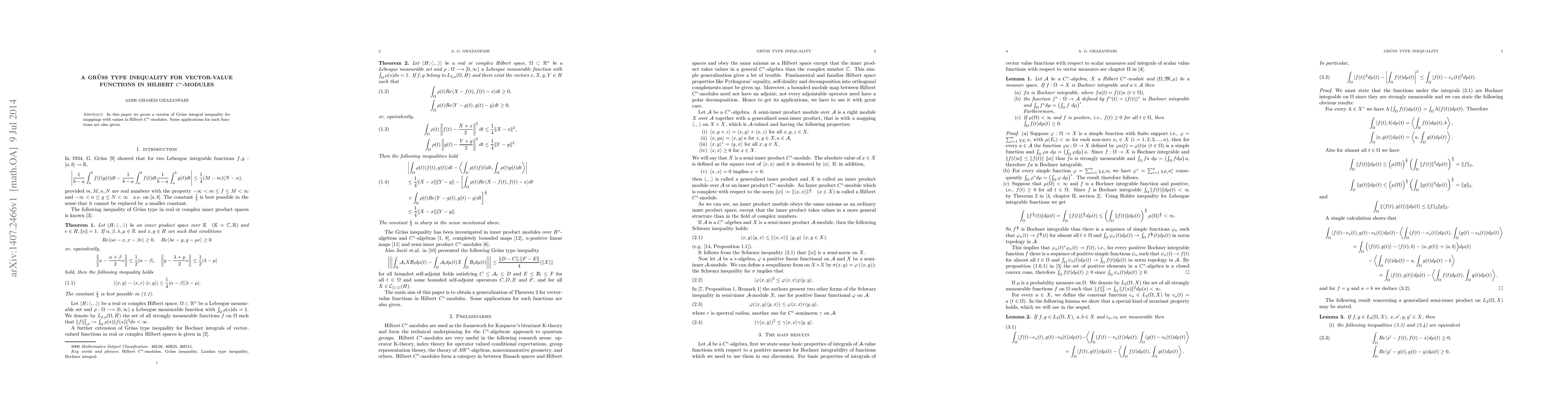 Summary: This paper establishes a Gruss type integral inequality for vector-valued functions within the context of Hilbert C*-modules, and provides applications for these functions.