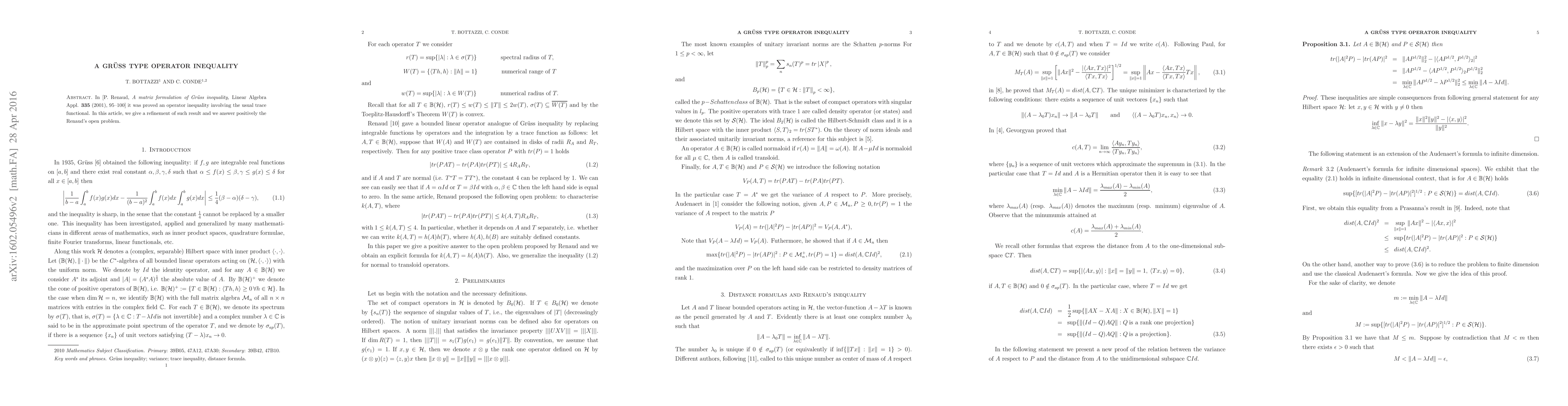 In [P. Renaud, "A matrix formulation of Gr\"uss inequality", Linear Algebra Appl. 335 (2001), 95--100] it was proved an operator inequality involving the usual trace functional. In this article, we give a refinement of such result and we answer positively the Renaud's open problem.