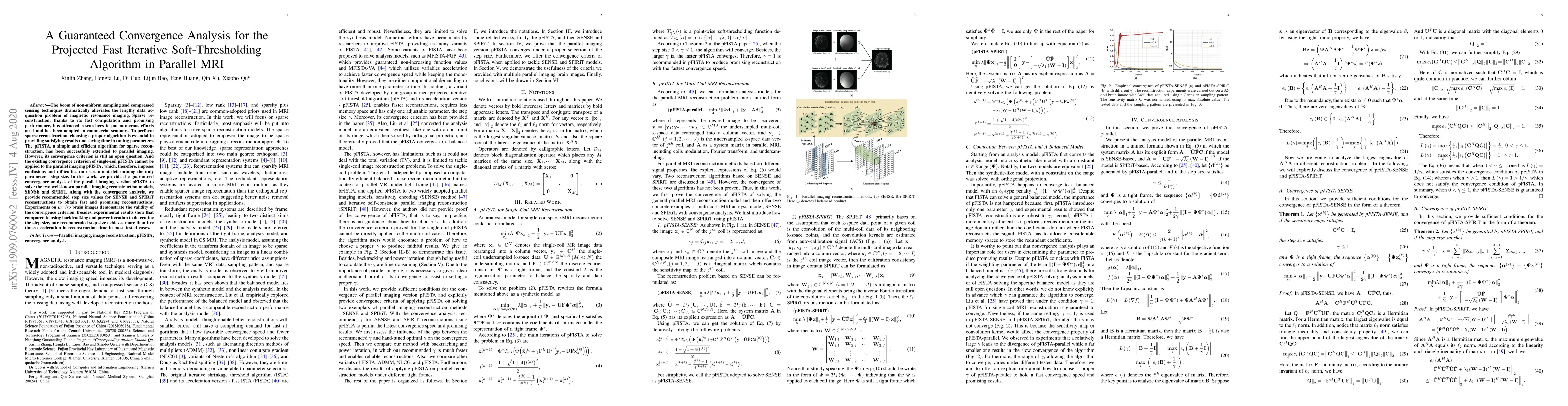 This paper provides a guaranteed convergence analysis for the parallel imaging version of the Projected Fast Iterative Soft-Thresholding Algorithm (pFISTA) for sparse reconstruction in MRI, offering recommended step size values for SENSE and SPIRiT models. Experimental results show significant acceleration in reconstruction time compared to alternative step size determination methods.