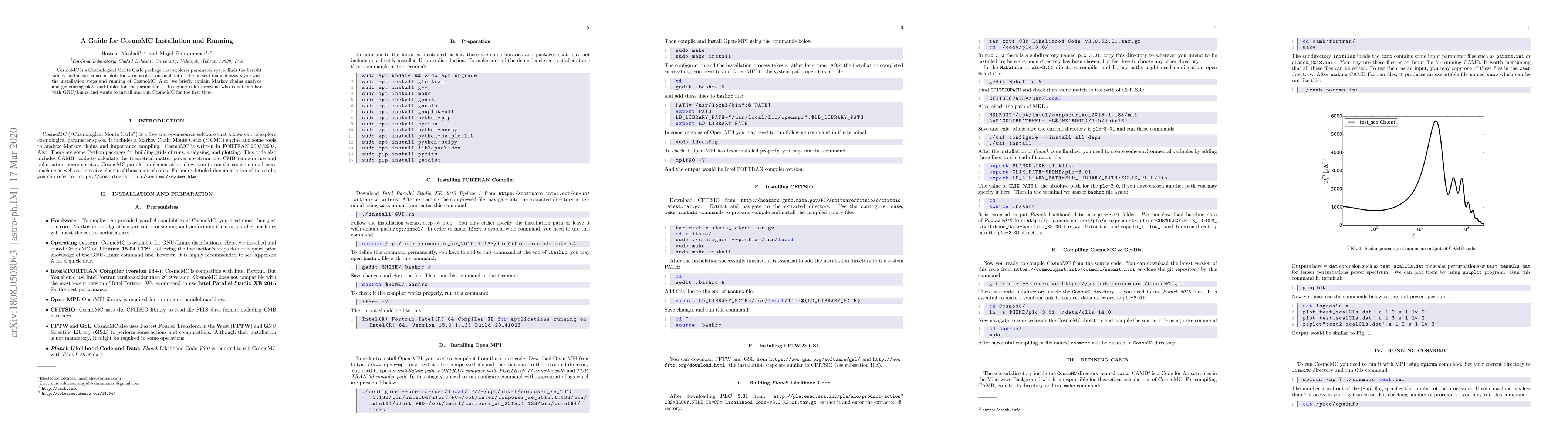 CosmoMC is a Cosmological Monte Carlo package that explores parameter space, finds the best-fit values, and makes contour plots for various observational data. The present manual assists you with the installation steps and running of CosmoMC. Also, we briefly explain Markov chains analysis and generating plots and tables for the parameters. This guide is for everyone who is not familiar with GNU/Linux and wants to install and run CosmoMC for the first time.