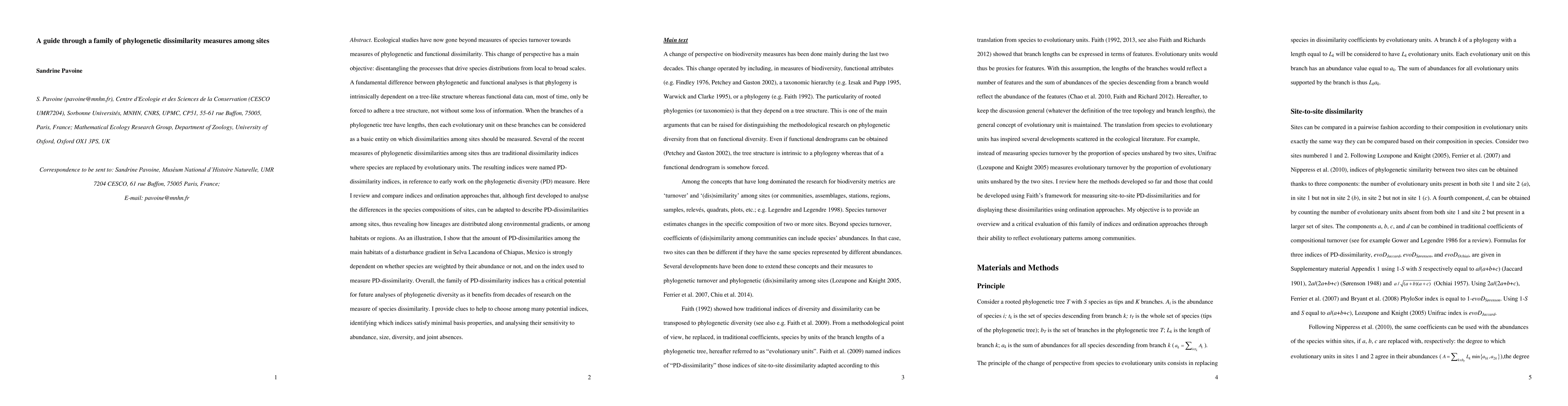 This paper reviews phylogenetic dissimilarity measures (PD-dissimilarity indices) that quantify evolutionary differences among sites, highlighting their utility in ecological studies. It compares various indices and ordination approaches, demonstrating their application in analyzing phylogenetic diversity across habitats, and provides guidance on selecting appropriate indices based on properties like sensitivity to abundance and diversity.