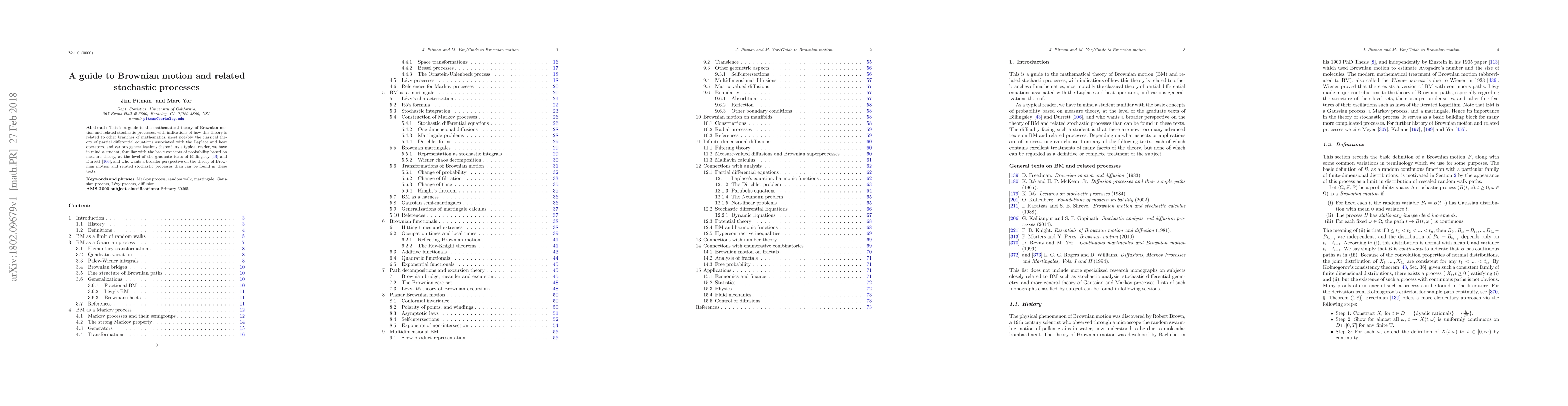 This is a guide to the mathematical theory of Brownian motion and related stochastic processes, with indications of how this theory is related to other branches of mathematics, most notably the classical theory of partial differential equations associated with the Laplace and heat operators, and various generalizations thereof. As a typical reader, we have in mind a student, familiar with the basic concepts of probability based on measure theory, at the level of the graduate texts of Billingsley and Durrett , and who wants a broader perspective on the theory of Brownian motion and related stochastic processes than can be found in these texts.