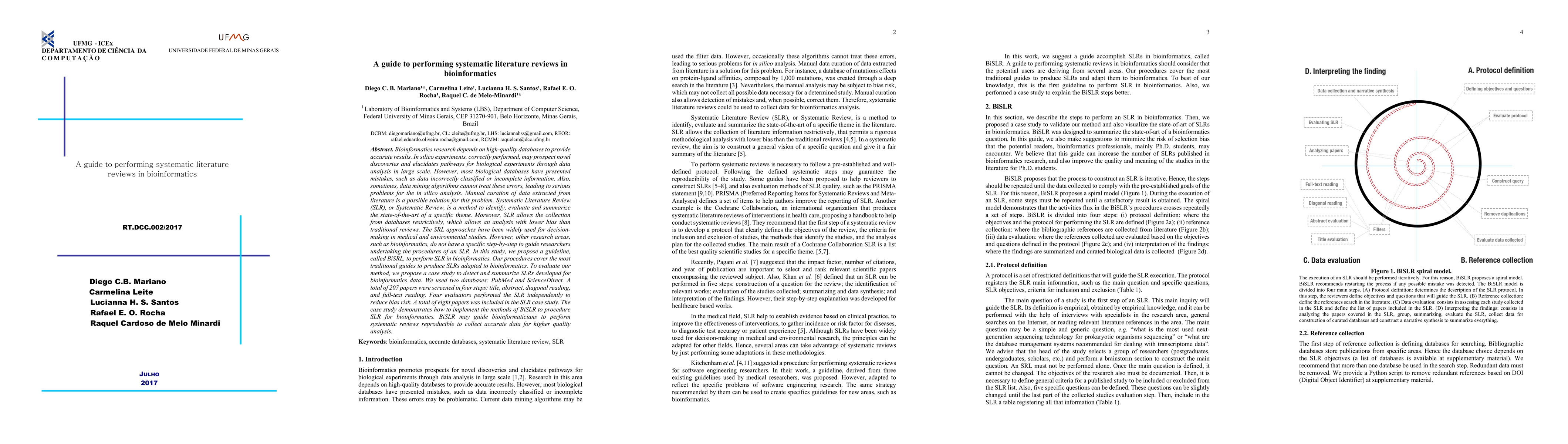 This paper proposes BiSRL, a guideline for conducting systematic literature reviews (SLR) in bioinformatics to address data inaccuracies and biases in biological databases. The study evaluates BiSRL through a case study involving 207 screened papers from PubMed and ScienceDirect, ultimately including 8 for detailed analysis, demonstrating its application in bioinformatics.
