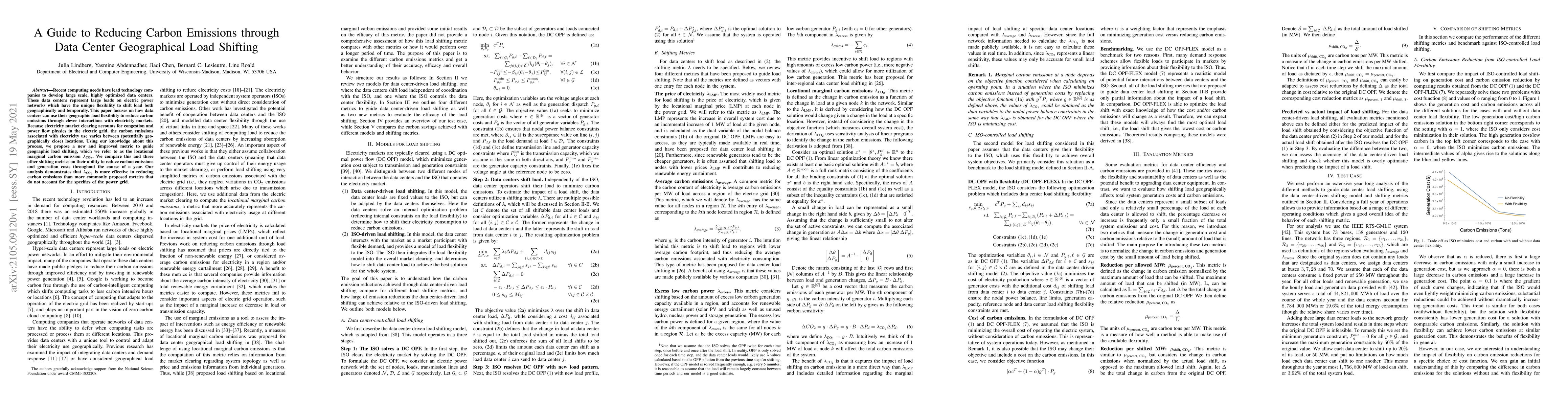 Recent computing needs have lead technology companies to develop large scale, highly optimized data centers. These data centers represent large loads on electric power networks which have the unique flexibility to shift load both geographically and temporally. This paper focuses on how data centers can use their geographic load flexibility to reduce carbon emissions through clever interactions with electricity markets. Because electricity market clearing accounts for congestion and power flow physics in the electric grid, the carbon emissions associated with electricity use varies between (potentially geographically close) locations. Using our knowledge about this process, we propose a new and improved metric to guide geographic load shifting, which we refer to as the locational marginal carbon emission $\lambda_{\text{CO}_2}$. We compare this and three other shifting metrics on their ability to reduce carbon emissions and generation costs throughout the course of a year. Our analysis demonstrates that $\lambda_{\text{CO}_2}$ is more effective in reducing carbon emissions than more commonly proposed metrics that do not account for the specifics of the power grid.