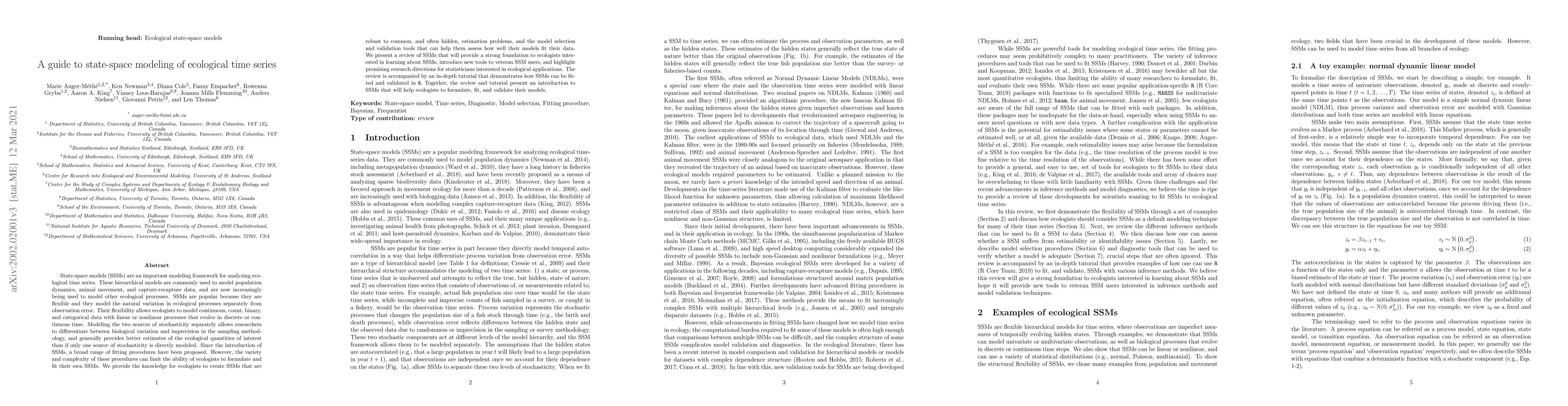 State-space models (SSMs) are an important modeling framework for analyzing ecological time series. These hierarchical models are commonly used to model population dynamics, animal movement, and capture-recapture data, and are now increasingly being used to model other ecological processes. SSMs are popular because they are flexible and they model the natural variation in ecological processes separately from observation error. Their flexibility allows ecologists to model continuous, count, binary, and categorical data with linear or nonlinear processes that evolve in discrete or continuous time. Modeling the two sources of stochasticity separately allows researchers to differentiate between biological variation (e.g., in birth processes) and imprecision in the sampling methodology, and generally provides better estimates of the ecological quantities of interest than if only one source of stochasticity is directly modeled. Since the introduction of SSMs, a broad range of fitting procedures have been proposed. However, the variety and complexity of these procedures can limit the ability of ecologists to formulate and fit their own SSMs. We provide the knowledge for ecologists to create SSMs that are robust to common, and often hidden, estimation problems, and the model selection and validation tools that can help them assess how well their models fit their data. In this paper, we present a review of SSMs that will provide a strong foundation to ecologists interested in learning about SSMs, introduce new tools to veteran SSM users, and highlight promising research directions for statisticians interested in ecological applications. The review is accompanied by an in-depth tutorial that demonstrates how SSMs models can be fitted and validated in R. Together, the review and tutorial present an introduction to SSMs that will help ecologists to formulate, fit, and validate their models.