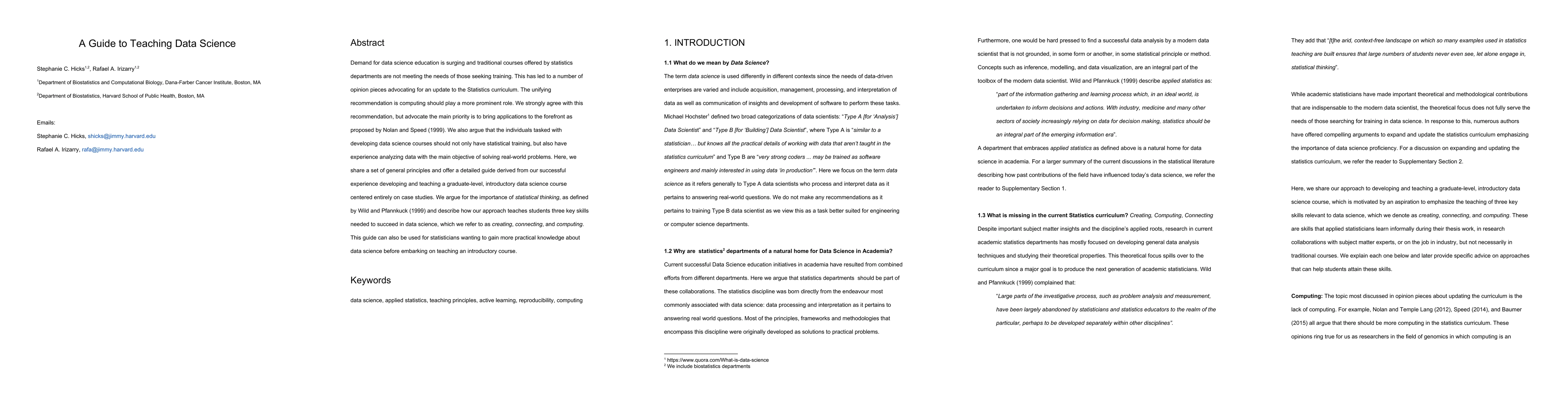 This paper proposes a guide for teaching data science, emphasizing the importance of practical applications and real-world problem-solving over traditional statistical theory. It advocates for a curriculum that prioritizes statistical thinking and equips instructors with both statistical training and practical data analysis experience.