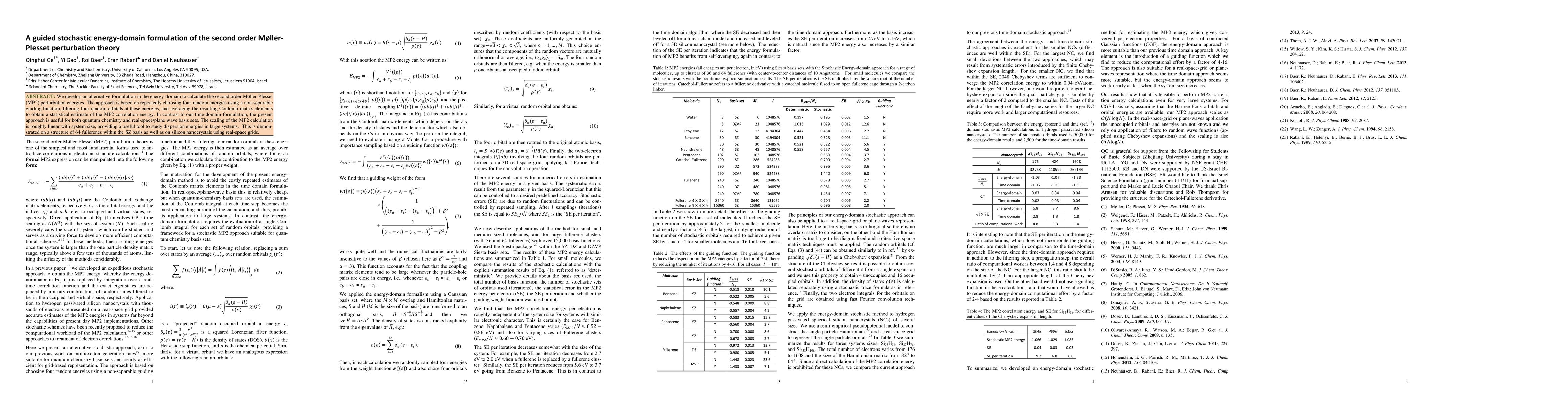 We develop an alternative formulation in the energy-domain to calculate the second order M{\o}ller-Plesset (MP2) perturbation energies. The approach is based on repeatedly choosing four random energies using a non-separable guiding function, filtering four random orbitals at these energies, and averaging the resulting Coulomb matrix elements to obtain a statistical estimate of the MP2 correlation energy. In contrast to our time-domain formulation, the present approach is useful for both quantum chemistry and real-space/plane wave basis sets. The scaling of the MP2 calculation is roughly linear with system size, providing a useful tool to study dispersion energies in large systems. This is demonstrated on a structure of 64 fullerenes within the SZ basis as well as on silicon nanocrystals using real-space grids.