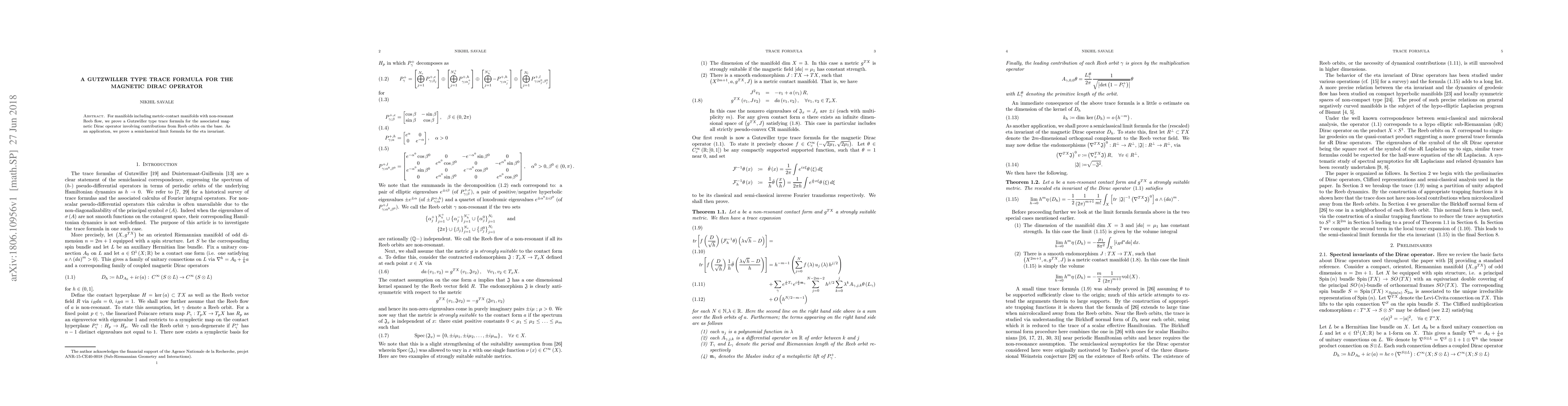 Summary: This paper establishes a Gutzwiller type trace formula for the magnetic Dirac operator on manifolds, including metric-contact manifolds, highlighting contributions from Reeb orbits. It also demonstrates a semiclassical limit formula for the eta invariant as an application.
