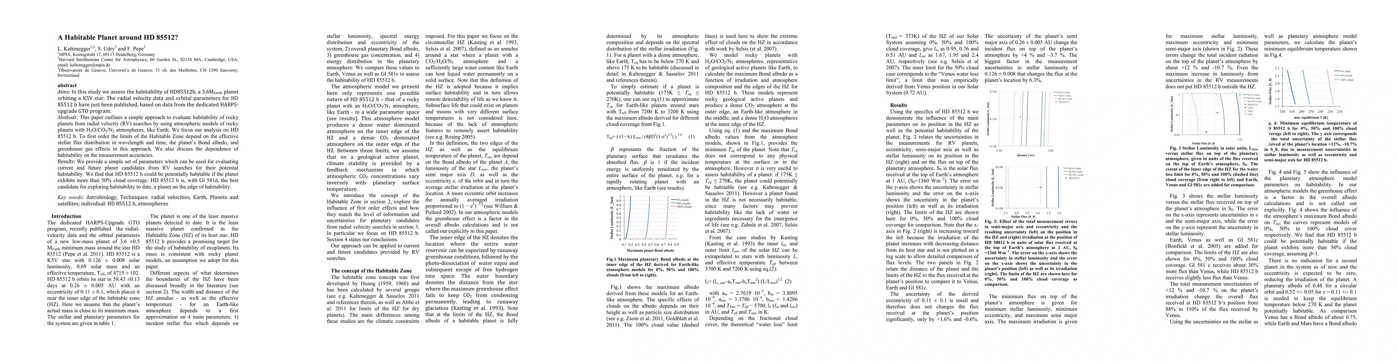 This study evaluates the habitability of HD 85512b, a 3.6M_Earth planet orbiting a K5V star, using atmospheric models and radial velocity data. The findings suggest HD 85512b could be potentially habitable if it has over 50% cloud coverage, making it a leading candidate for habitability studies.