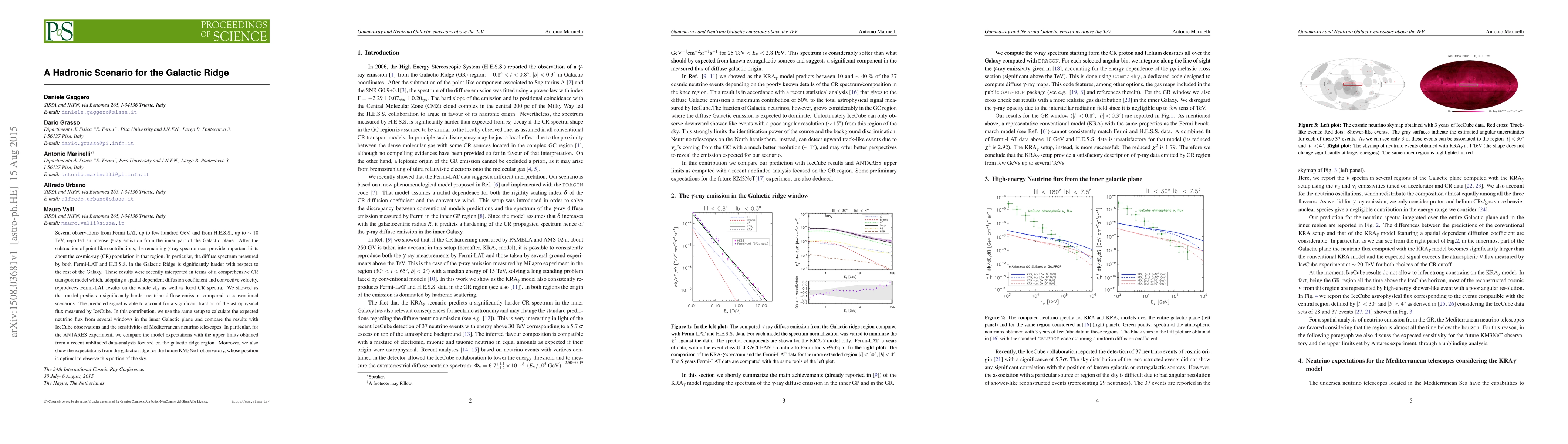 Several observations from Fermi-LAT, up to few hundred GeV, and from H.E.S.S., up to $\sim$ 10 TeV, reported an intense $\gamma$-ray emission from the inner part of the Galactic plane. After the subtraction of point-like contributions, the remaining $\gamma$-ray spectrum can provide important hints about the cosmic-ray (CR) population in that region. In particular, the diffuse spectrum measured by both Fermi-LAT and H.E.S.S. in the Galactic Ridge is significantly harder with respect to the rest of the Galaxy. These results were recently interpreted in terms of a comprehensive CR transport model which, adopting a spatial dependent diffusion coefficient and convective velocity, reproduces Fermi-LAT results on the whole sky as well as local CR spectra. We showed as that model predicts a significantly harder neutrino diffuse emission compared to conventional scenarios: The predicted signal is able to account for a significant fraction of the astrophysical flux measured by IceCube. In this contribution, we use the same setup to calculate the expected neutrino flux from several windows in the inner Galactic plane and compare the results with IceCube observations and the sensitivities of Mediterranean neutrino telescopes. In particular, for the ANTARES experiment, we compare the model expectations with the upper limits obtained from a recent unblinded data-analysis focused on the galactic ridge region. Moreover, we also show the expectations from the galactic ridge for the future KM3NeT observatory, whose position is optimal to observe this portion of the sky.