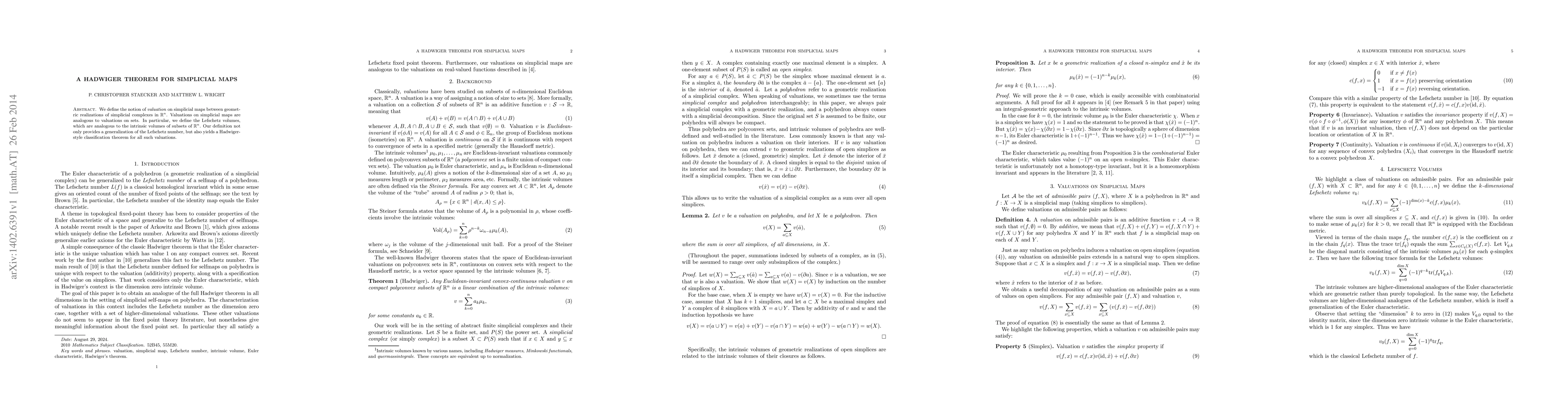 This paper introduces valuations on simplicial maps, generalizing Lefschetz numbers and intrinsic volumes. It establishes a Hadwiger-style classification theorem for these valuations on simplicial maps between geometric realizations of simplicial complexes in $\mathbb{R}^n$.
