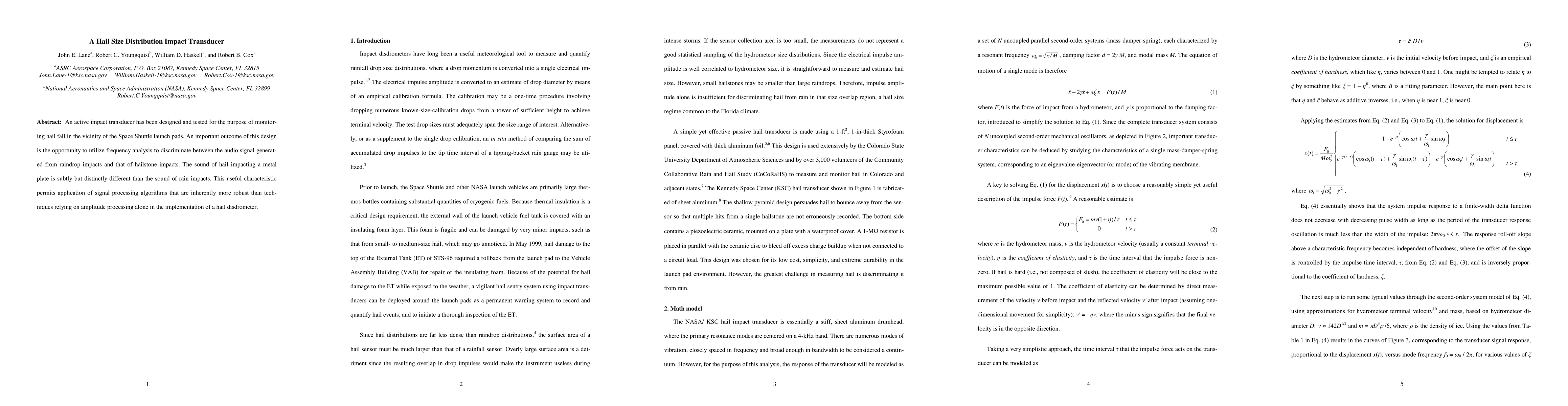 This research presents a novel active impact transducer designed to monitor hail fall near Space Shuttle launch pads, utilizing frequency analysis to distinguish hail from rain impacts. The distinct sound of hail impacts allows for more robust signal processing compared to amplitude-based techniques.