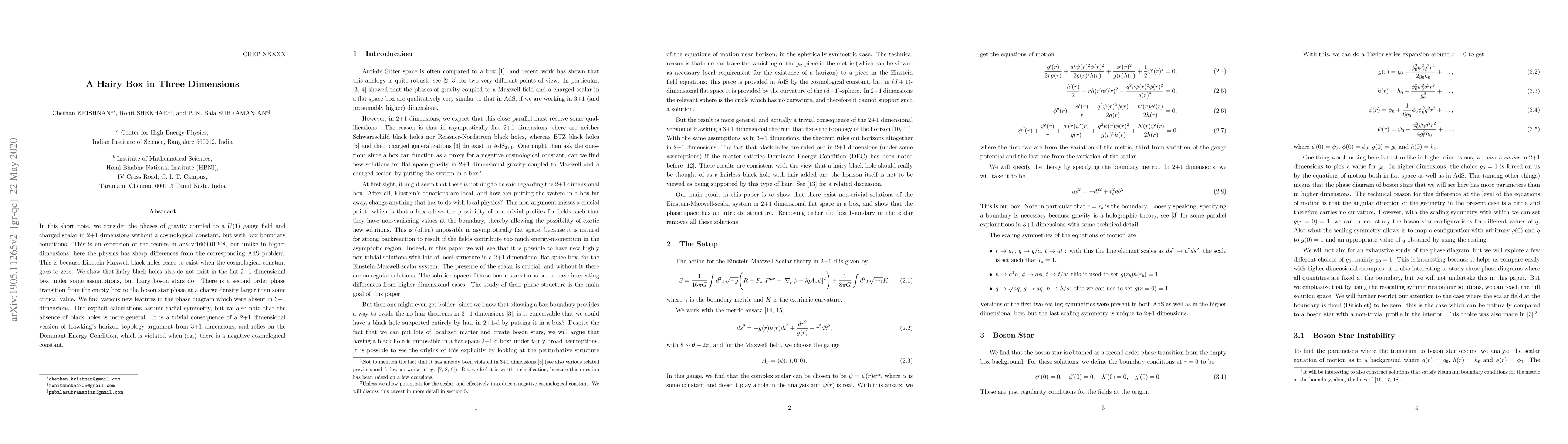 In this short note, we consider the phases of gravity coupled to a $U(1)$ gauge field and charged scalar in 2+1 dimensions without a cosmological constant, but with box boundary conditions. This is an extension of the results in arXiv:1609.01208, but unlike in higher dimensions, here the physics has sharp differences from the corresponding AdS problem. This is because Einstein-Maxwell black holes cease to exist when the cosmological constant goes to zero. We show that hairy black holes also do not exist in the flat 2+1 dimensional box under some assumptions, but hairy boson stars do. There is a second order phase transition from the empty box to the boson star phase at a charge density larger than some critical value. We find various new features in the phase diagram which were absent in 3+1 dimensions. Our explicit calculations assume radial symmetry, but we also note that the absence of black holes is more general. It is a trivial consequence of a 2+1 dimensional version of Hawking's horizon topology argument from 3+1 dimensions, and relies on the Dominant Energy Condition, which is violated when (eg.) there is a negative cosmological constant.