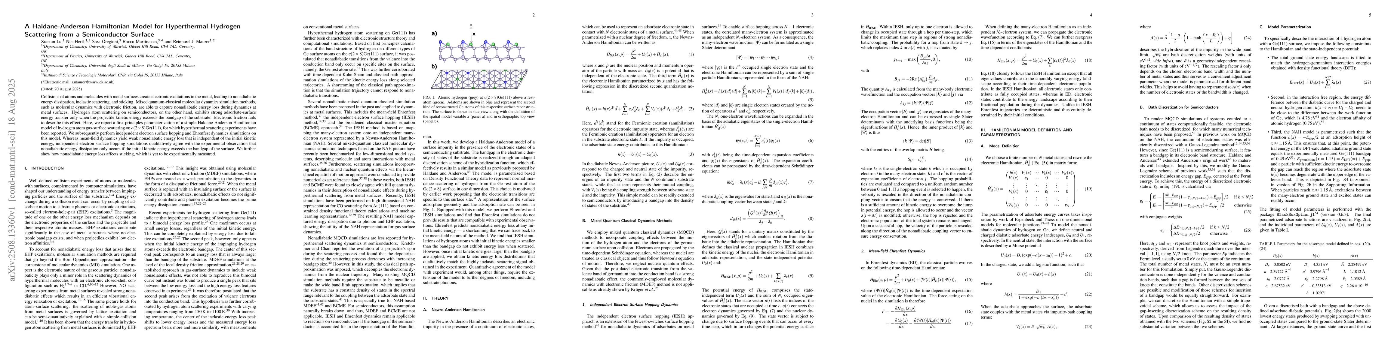 Collisions of atoms and molecules with metal surfaces create electronic excitations in the metal, leading to nonadiabatic energy dissipation, inelastic scattering, and sticking. Mixed quantum-classical molecular dynamics simulation methods, such as molecular dynamics with electronic friction, are able to capture nonadiabatic energy loss during dynamics at metal surfaces. Hydrogen atom scattering on semiconductors, on the other hand, exhibits strong adsorbate-surface energy transfer only when the projectile kinetic energy exceeds the bandgap of the substrate. Electronic friction fails to describe this effect. Here, we report a first-principles parameterization of a simple Haldane-Anderson Hamiltonian model of hydrogen atom gas-surface scattering on $c(2\times8)$Ge(111), for which hyperthermal scattering experiments have been reported. We subsequently perform independent electron surface hopping and Ehrenfest dynamics simulations on this model. Whereas mean-field dynamics yield weak nonadiabatic energy loss that is independent of the initial kinetic energy, independent electron surface hopping simulations qualitatively agree with the experimental observation that nonadiabatic energy dissipation only occurs if the initial kinetic energy exceeds the bandgap of the surface. We further show how nonadiabatic energy loss affects sticking, which is yet to be experimentally measured.