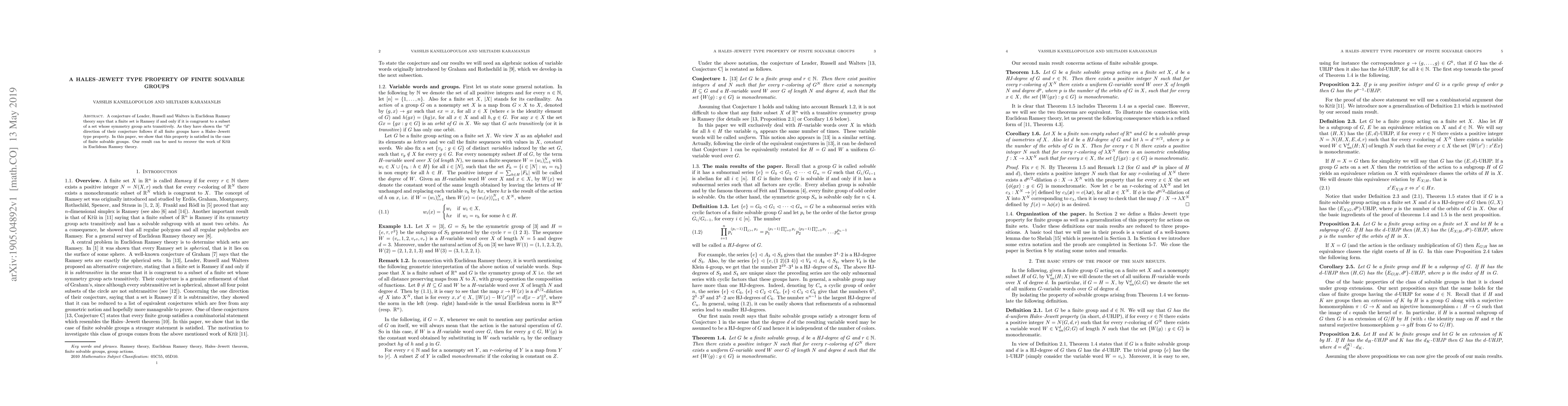 A conjecture of Leader, Russell and Walters in Euclidean Ramsey theory says that a finite set is Ramsey if and only if it is congruent to a subset of a set whose symmetry group acts transitively. As they have shown the ``if" direction of their conjecture follows if all finite groups have a Hales--Jewett type property. In this paper, we show that this property is satisfied in the case of finite solvable groups. Our result can be used to recover the work of K\v{r}\'i\v{z} in Euclidean Ramsey theory.