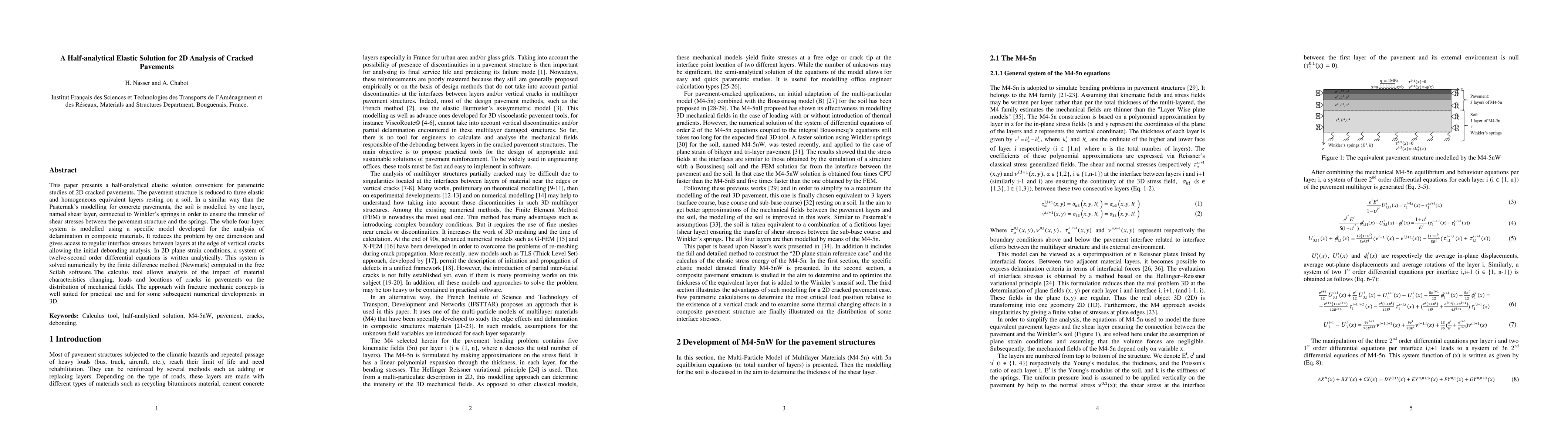 This paper introduces a half-analytical elastic solution for 2D cracked pavement analysis, reducing the structure to three layers. It employs a specific model for delamination in composite materials, solving a system of differential equations numerically using the finite difference method. The approach facilitates parametric studies of material properties, loads, and crack locations, with potential for 3D numerical developments.