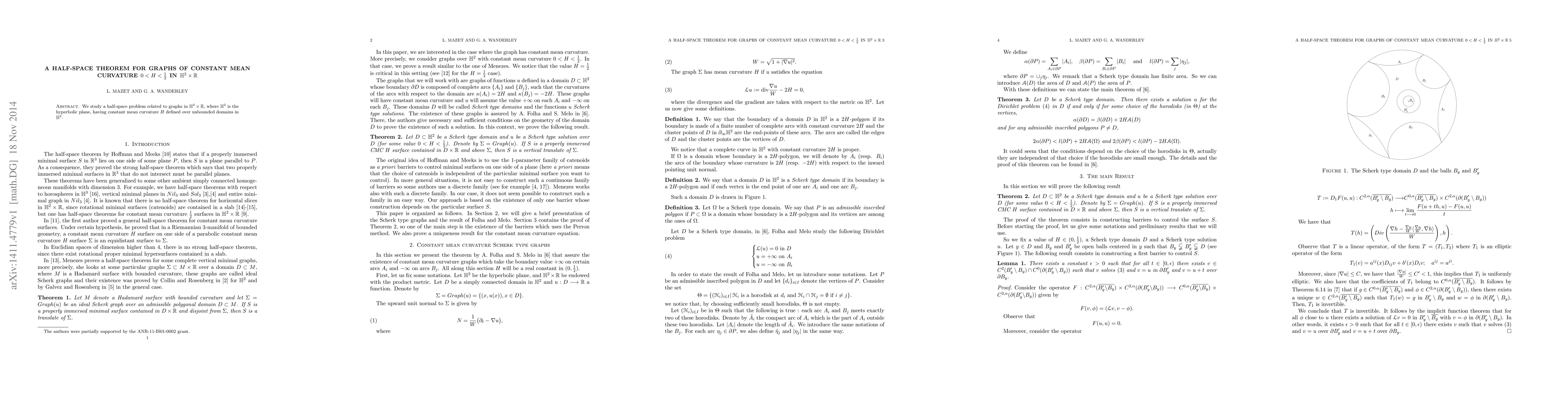 This research establishes a half-space theorem for graphs with constant mean curvature 0<H<1/2 in the product space H^2 x R, where H^2 denotes the hyperbolic plane. The study investigates geometric properties of these graphs over unbounded domains, contributing to understanding their spatial behavior.