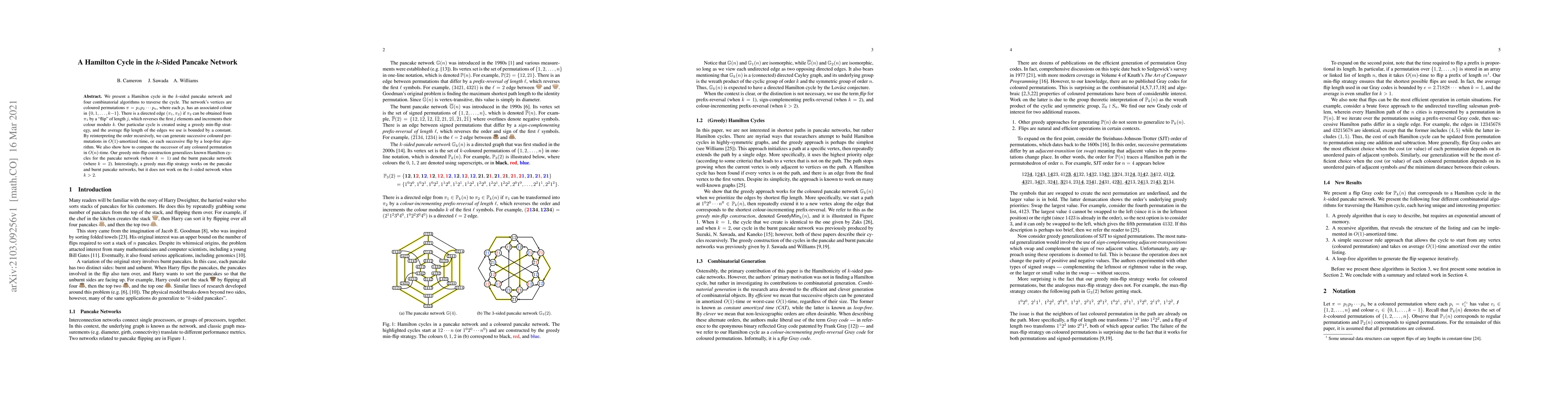 Researchers found a Hamilton cycle in the k-sided pancake network, a graph with vertices representing coloured permutations, using a greedy min-flip strategy. This discovery opens new possibilities for traversing complex networks with efficient algorithms.