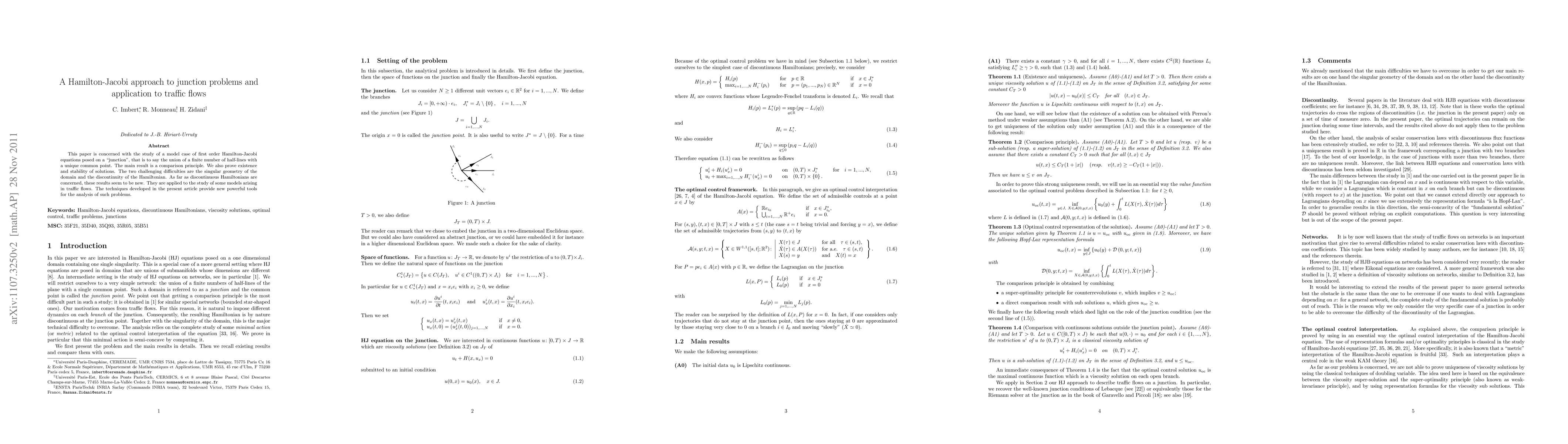 This paper develops a Hamilton-Jacobi approach to solve first-order equations in junction problems, proving a comparison principle, existence, and stability of solutions. The techniques are applied to traffic flow models, offering new tools for analyzing such systems.