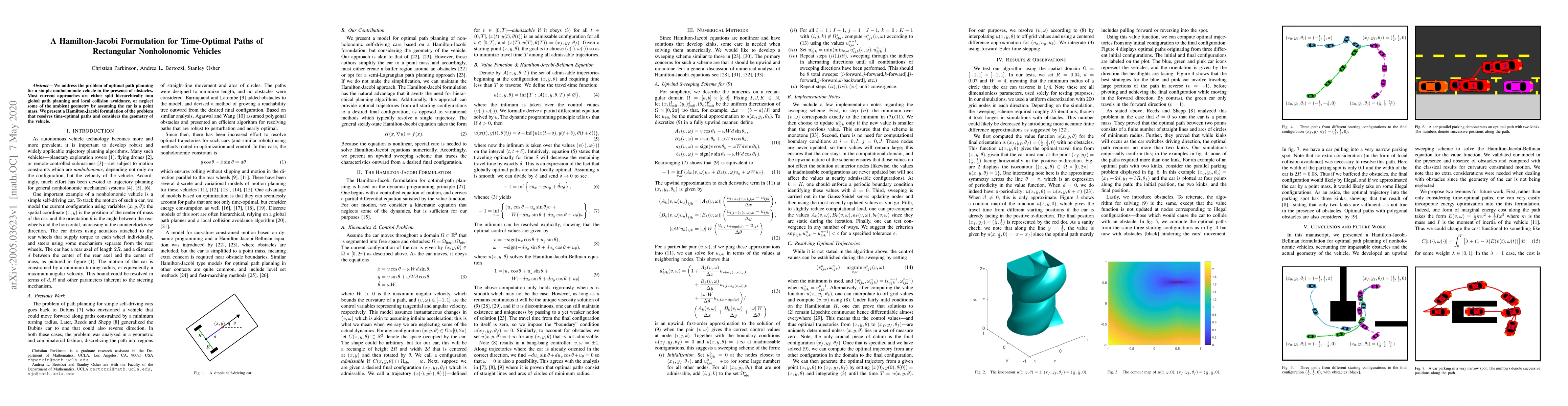 We address the problem of optimal path planning for a simple nonholonomic vehicle in the presence of obstacles. Most current approaches are either split hierarchically into global path planning and local collision avoidance, or neglect some of the ambient geometry by assuming the car is a point mass. We present a Hamilton-Jacobi formulation of the problem that resolves time-optimal paths and considers the geometry of the vehicle.