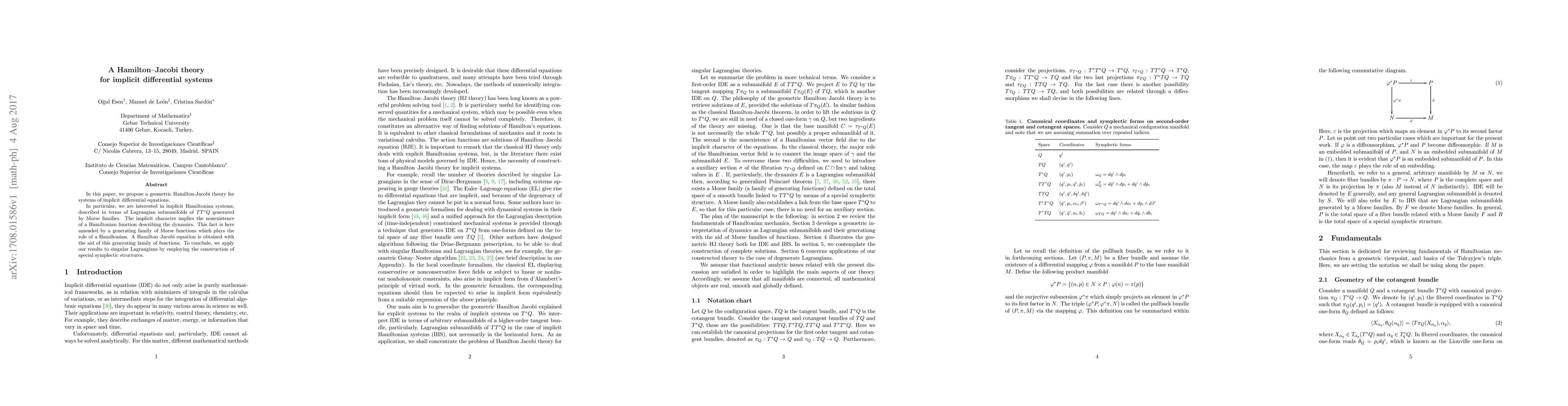 This paper develops a geometric Hamilton-Jacobi theory for implicit differential systems, specifically for implicit Hamiltonian systems represented by Lagrangian submanifolds. It introduces Morse functions as substitutes for the non-existent Hamiltonian function and derives a Hamilton-Jacobi equation using these functions, concluding with applications to singular Lagrangians through special symplectic structures.