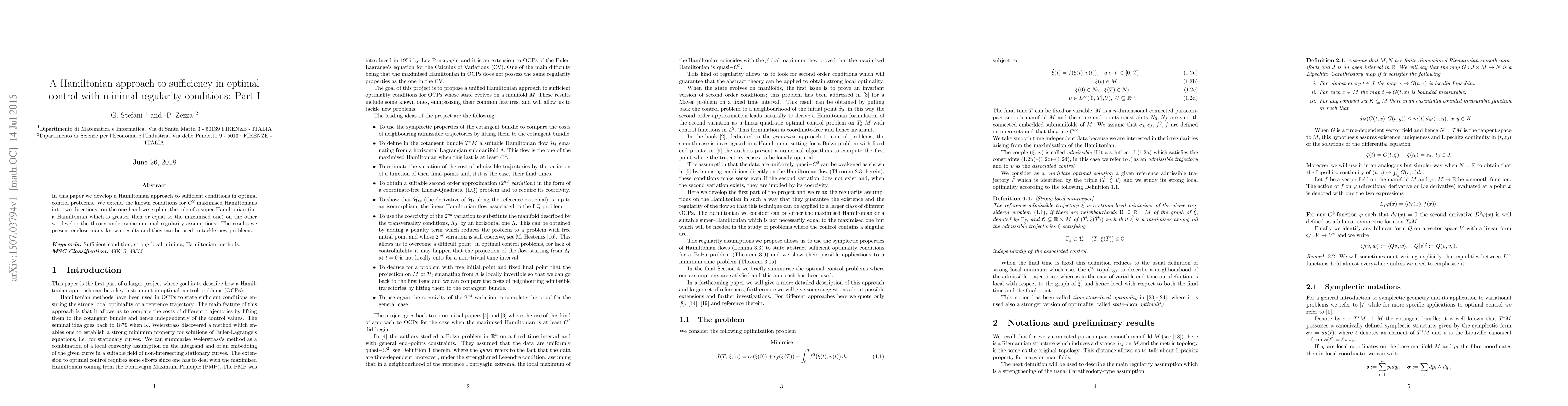 In this paper we develop a Hamiltonian approach to sufficient conditions in optimal control problems. We extend the known conditions for $C^2$ maximised Hamiltonians into two directions: on the one hand we explain the role of a super Hamiltonian (i.e. a Hamiltonian which is greater then or equal to the maximised one) on the other we develop the theory under some minimal regularity assumptions. The results we present enclose many known results and they can be used to tackle new problems.