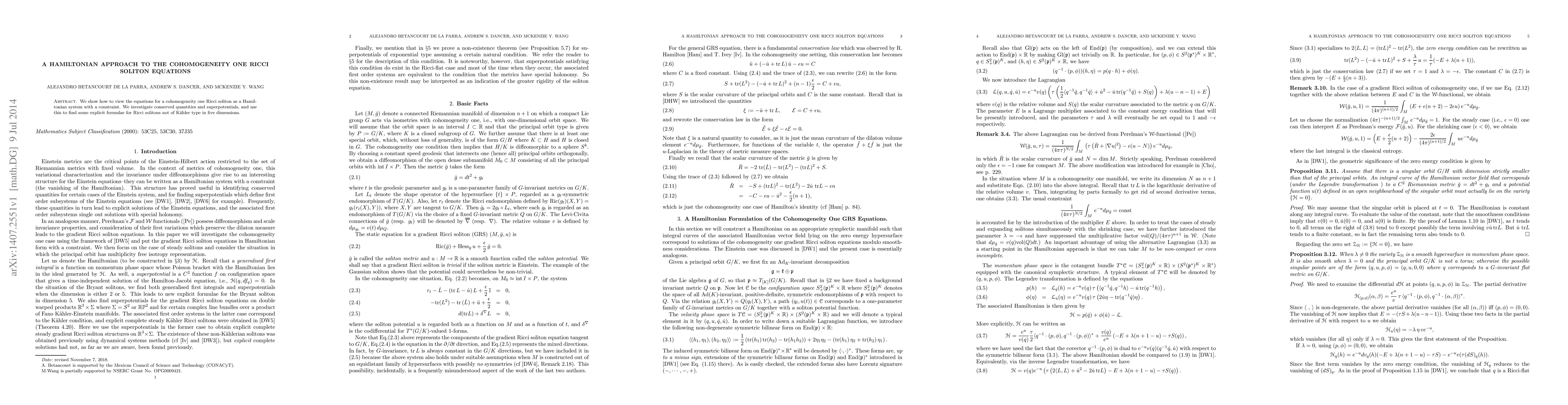 This paper demonstrates a Hamiltonian framework for cohomogeneity one Ricci soliton equations, revealing conserved quantities and superpotentials, and derives explicit formulae for non-Kähler Ricci solitons in five dimensions.