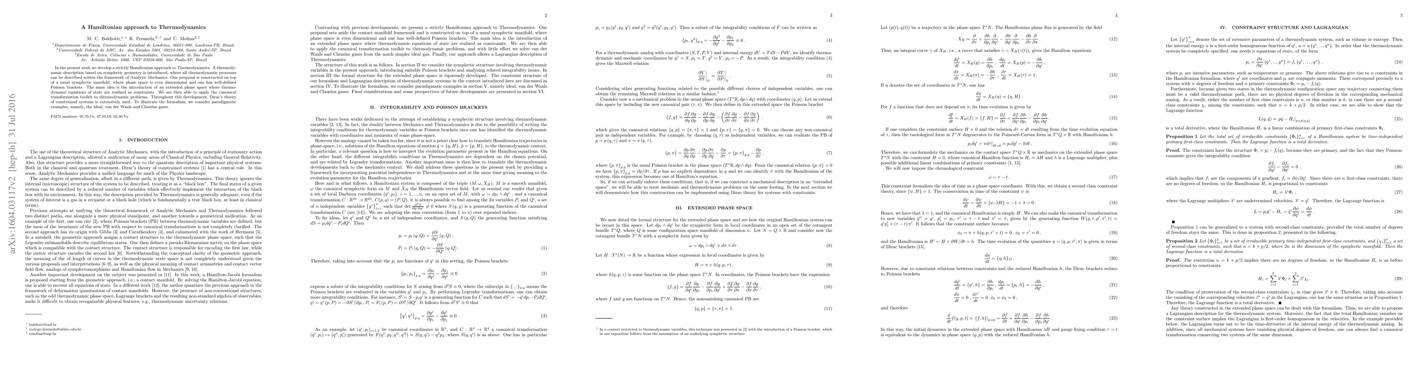 This paper proposes a Hamiltonian approach to Thermodynamics using symplectic geometry, integrating thermodynamic processes within Analytic Mechanics. It introduces an extended phase space with constraints realized by thermodynamic equations of state, employing Dirac's theory of constrained systems and canonical transformations for analysis, illustrated with ideal, van der Waals, and Clausius gases.