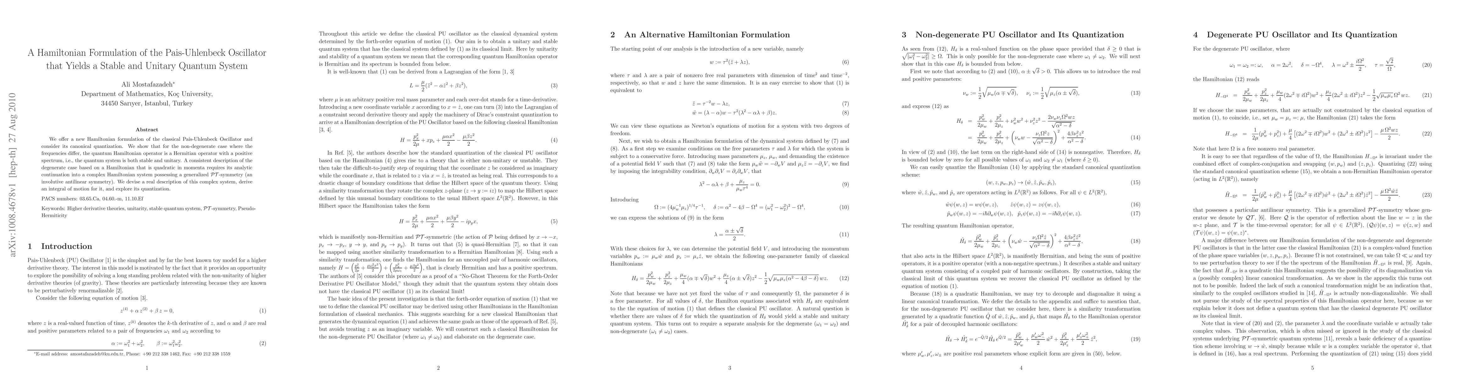 We offer a new Hamiltonian formulation of the classical Pais-Uhlenbeck Oscillator and consider its canonical quantization. We show that for the non-degenerate case where the frequencies differ, the quantum Hamiltonian operator is a Hermitian operator with a positive spectrum, i.e., the quantum system is both stable and unitary. A consistent description of the degenerate case based on a Hamiltonian that is quadratic in momenta requires its analytic continuation into a complex Hamiltonian system possessing a generalized PT-symmetry (an involutive antilinear symmetry). We devise a real description of this complex system, derive an integral of motion for it, and explore its quantization.