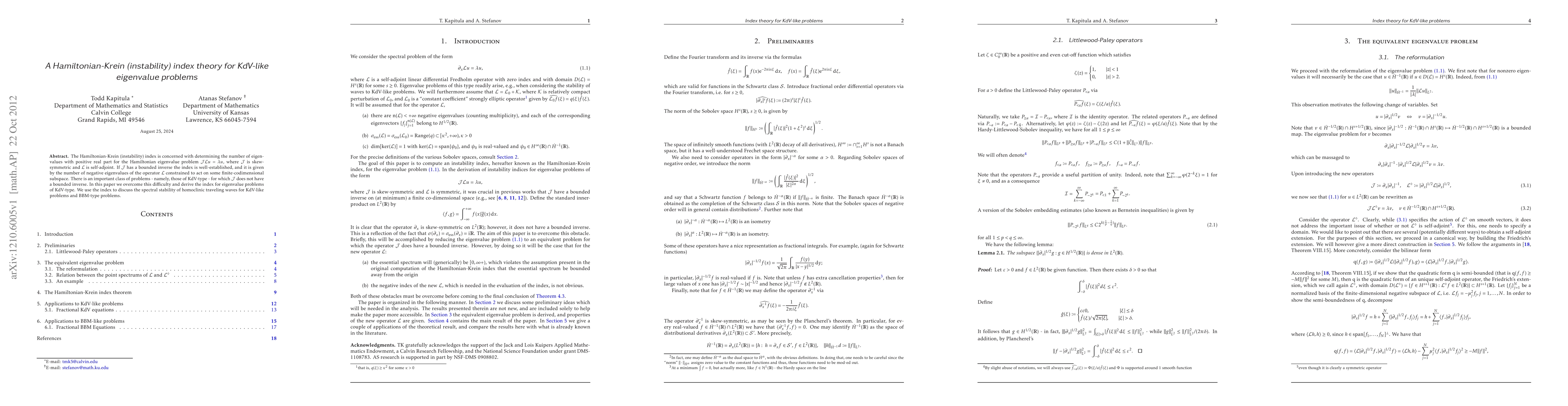 The Hamiltonian-Krein (instability) index is concerned with determining the number of eigenvalues with positive real part for the Hamiltonian eigenvalue problem $ J L u=\lambda u$, where $J$ is skew-symmetric and $L$ is self-adjoint. If $J$ has a bounded inverse the index is well-established, and it is given by the number of negative eigenvalues of the operator $L$ constrained to act on some finite-codimensional subspace. There is an important class of problems - namely, those of KdV-type - for which $J$ does not have a bounded inverse. In this paper we overcome this difficulty and derive the index for eigenvalue problems of KdV-type. We use the index to discuss the spectral stability of homoclinic traveling waves for KdV-like problems and BBM-type problems.