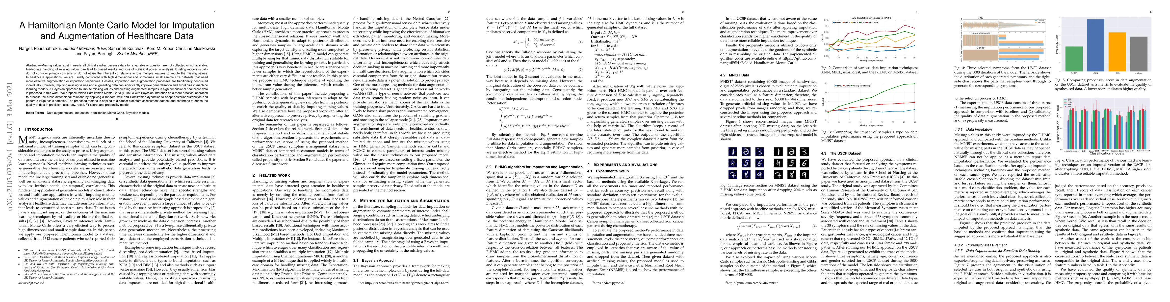 This paper proposes a folded Hamiltonian Monte Carlo (F-HMC) model for imputing missing values and augmenting healthcare data, leveraging Bayesian inference to handle high-dimensional data and improve generalization. The method effectively addresses privacy concerns and utilizes cross-dimensional correlations, demonstrating improved precision, accuracy, recall, F1 score, and propensity metrics in a cancer symptom assessment dataset.