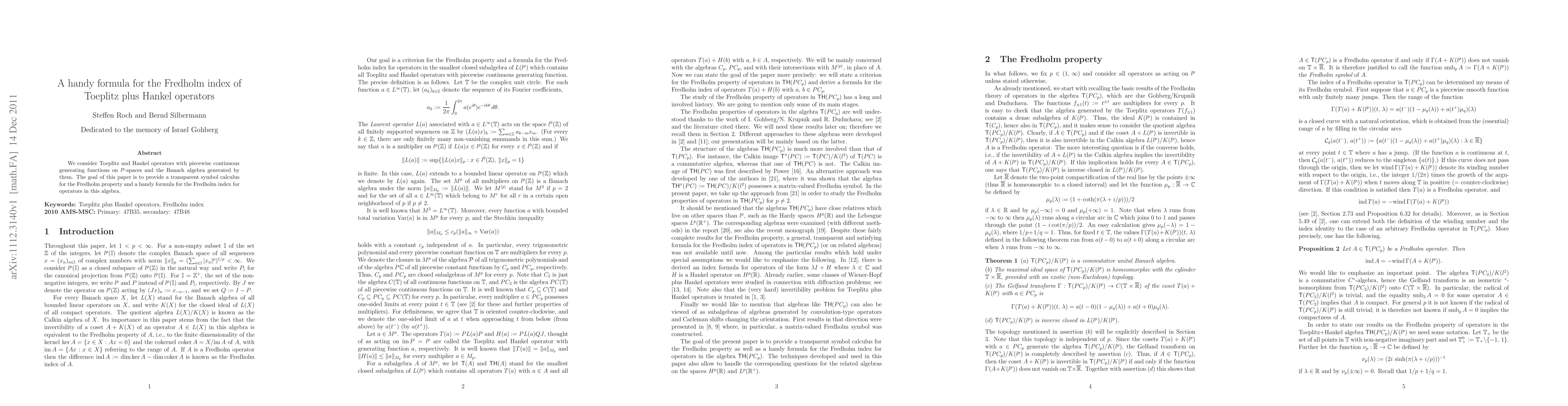 This paper introduces a clear symbol calculus for determining the Fredholm property and presents a simple formula for calculating the Fredholm index of Toeplitz plus Hankel operators with piecewise continuous generating functions in $l^p$-spaces.